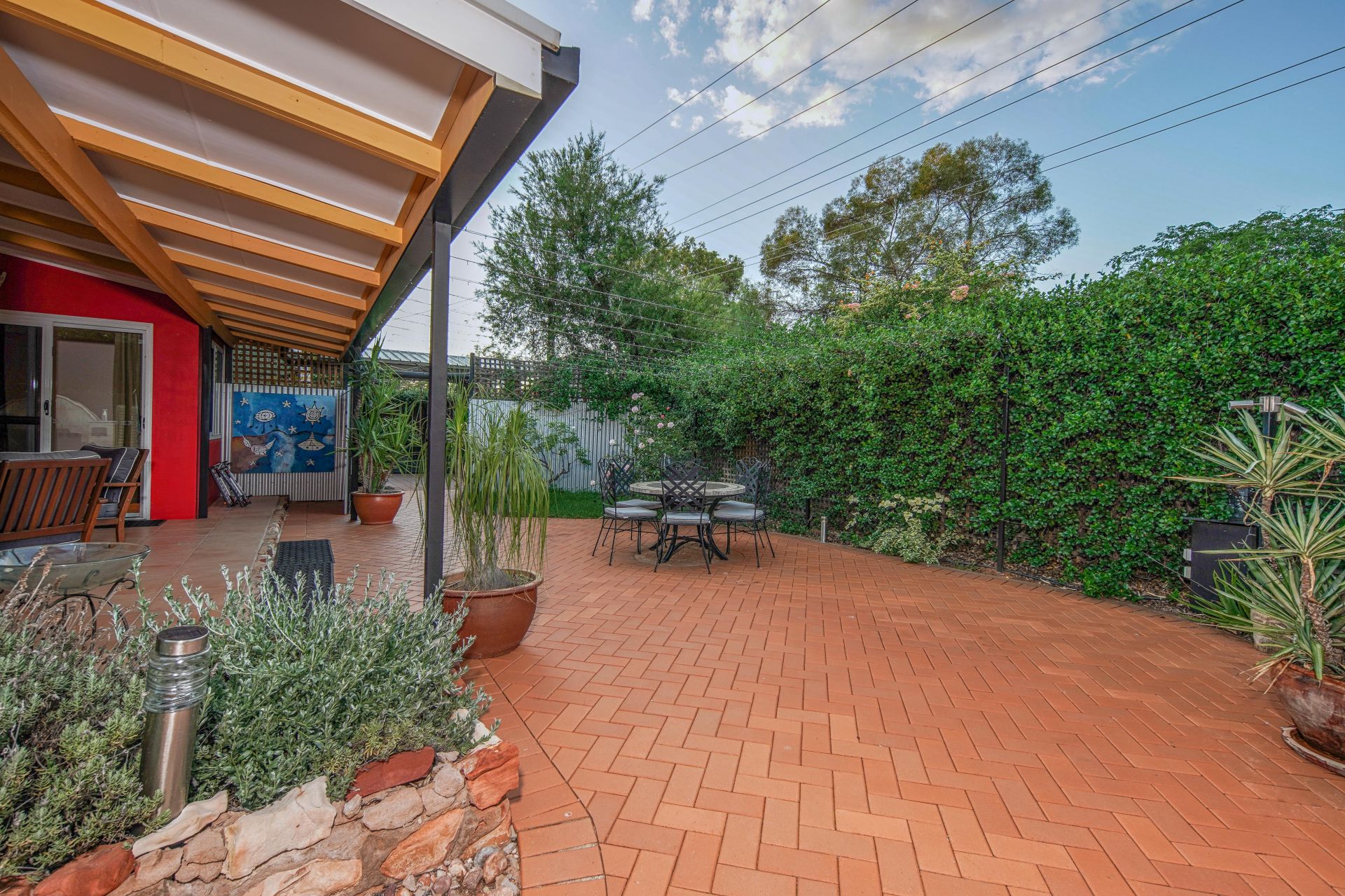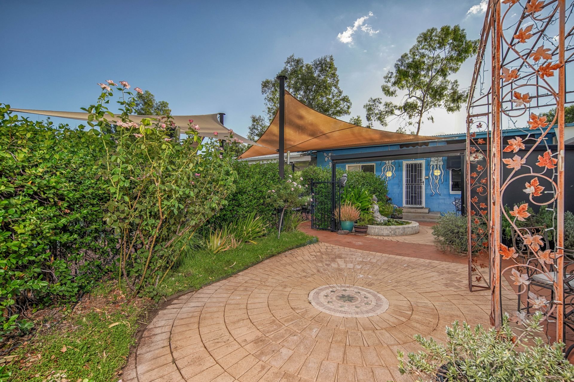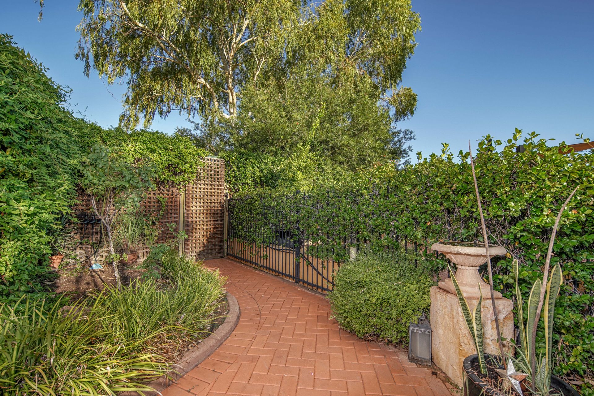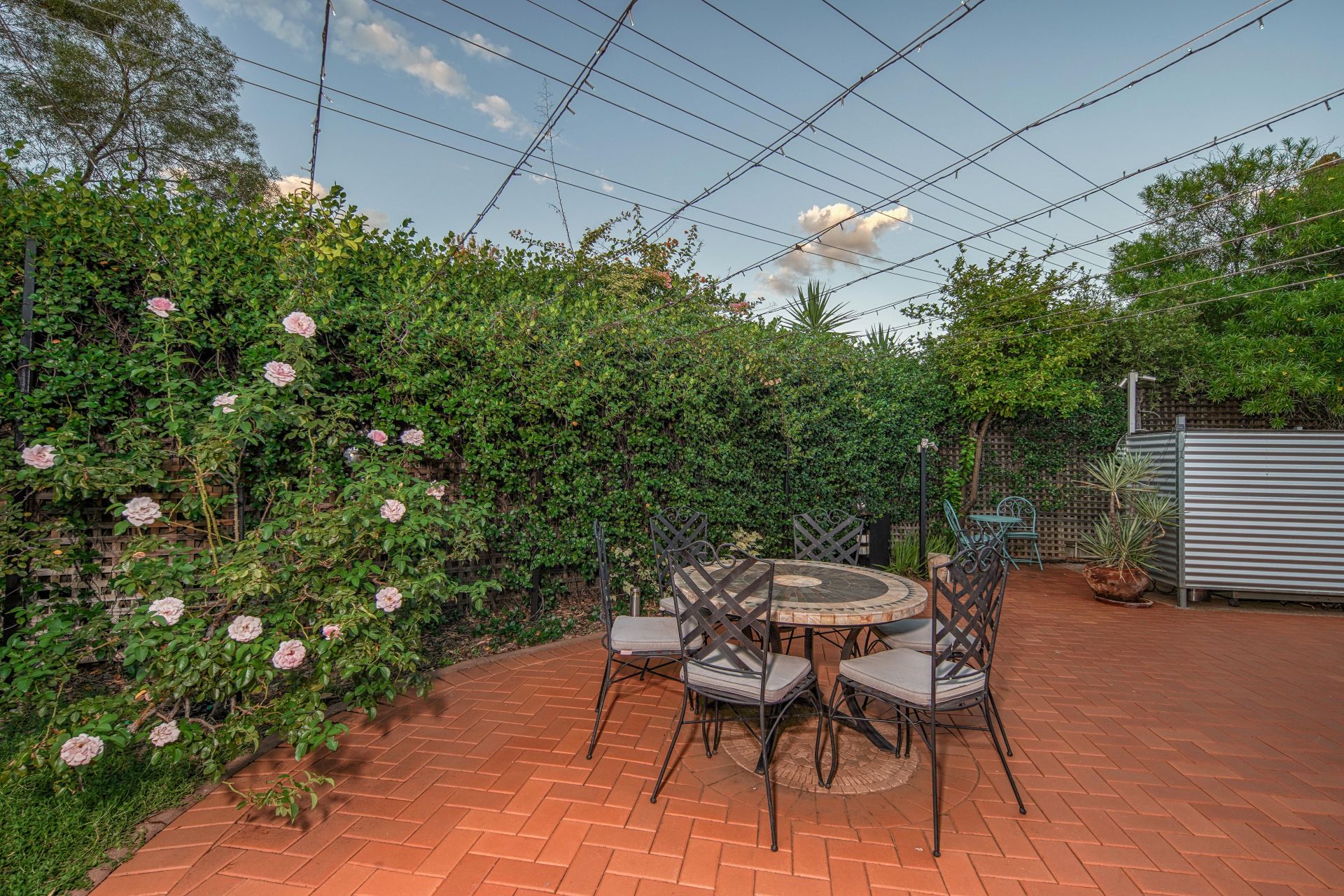 Tall boundary walls adorned with jasmine and honeysuckle provide privacy and security while framing the lush, fully reticulated gardens. A curated selection of established plantings, fruiting citrus trees, and flourishing roses add seasonal colour and fragrance throughout the year. Timed irrigation ensures low-maintenance, year-round vibrancy.