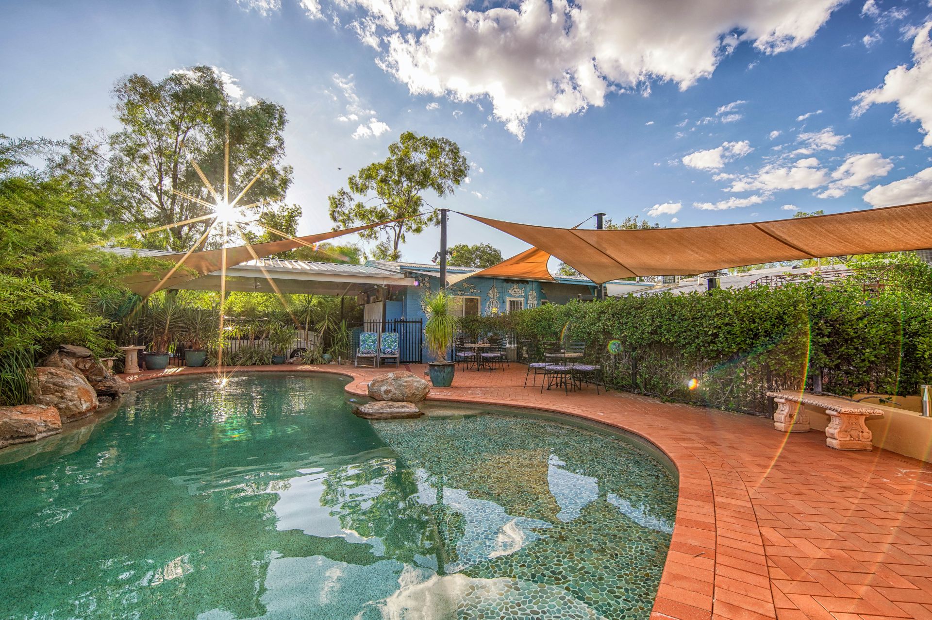 At the heart of the property lies a stunning 16-metre in-ground solar-heated saltwater pool, complete with a tranquil waterfall. Fringed by lush gardens, secluded verandas, and serene seating and BBQ areas, the pool zone is a private oasis that invites both relaxation and quiet reflection.