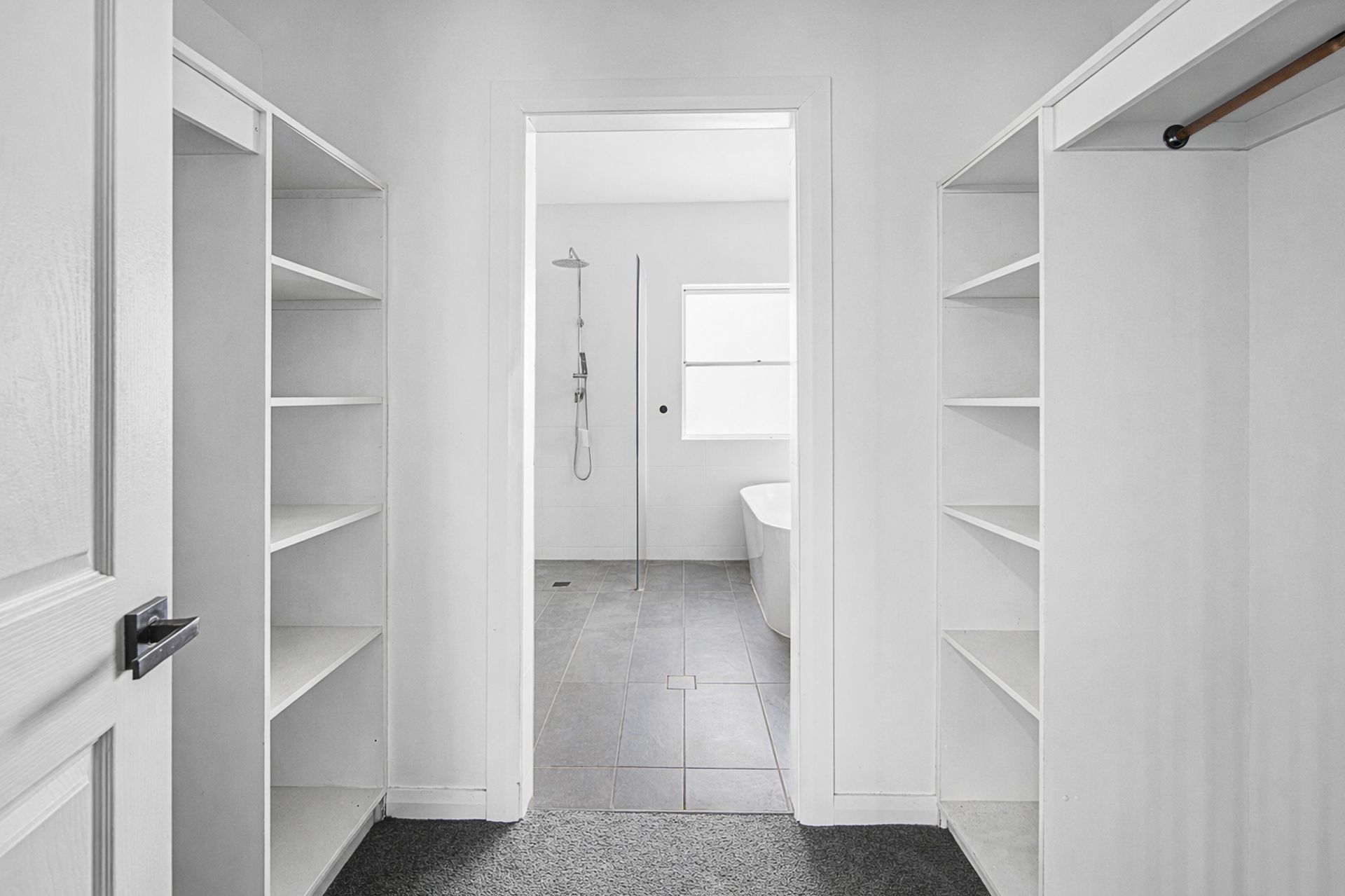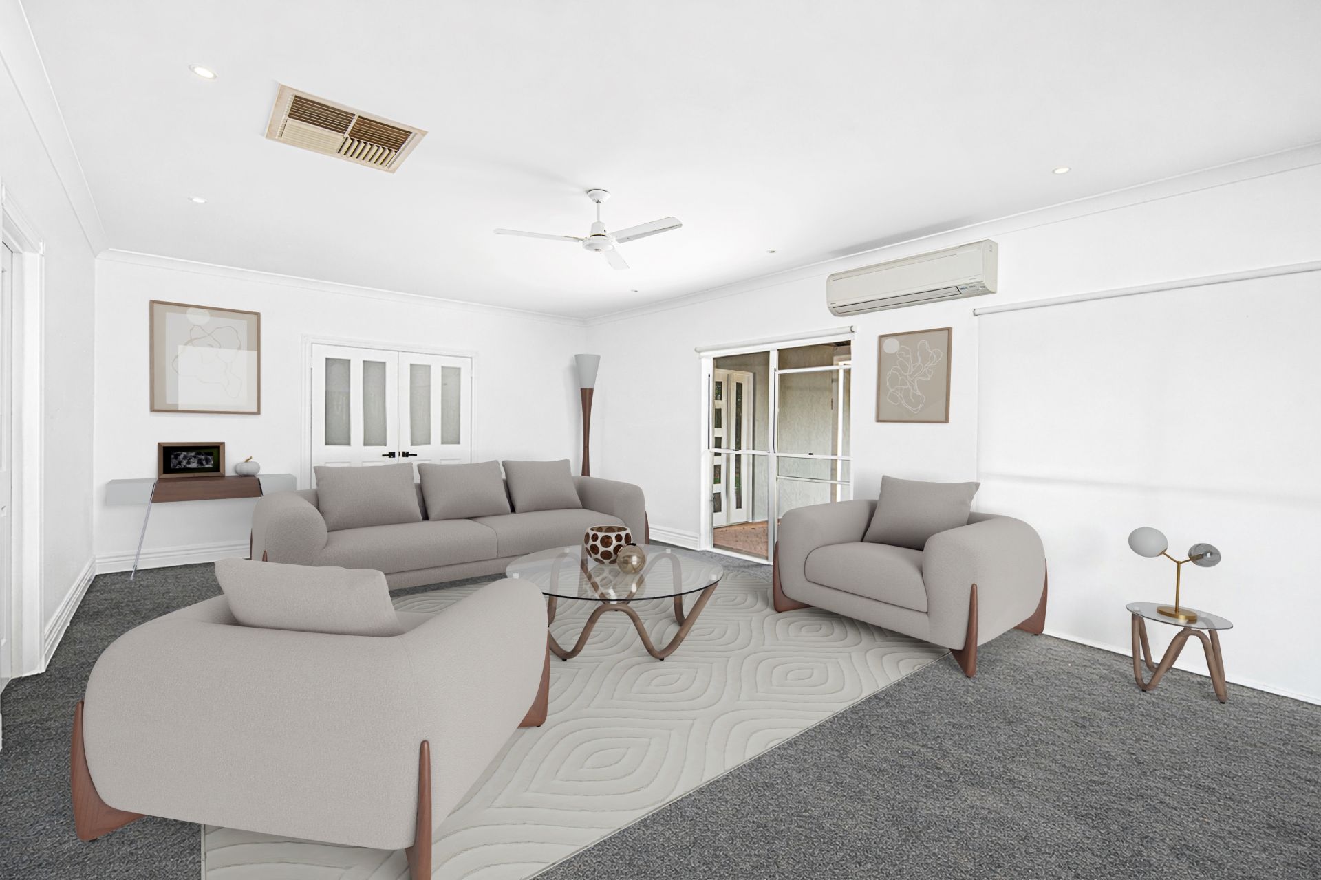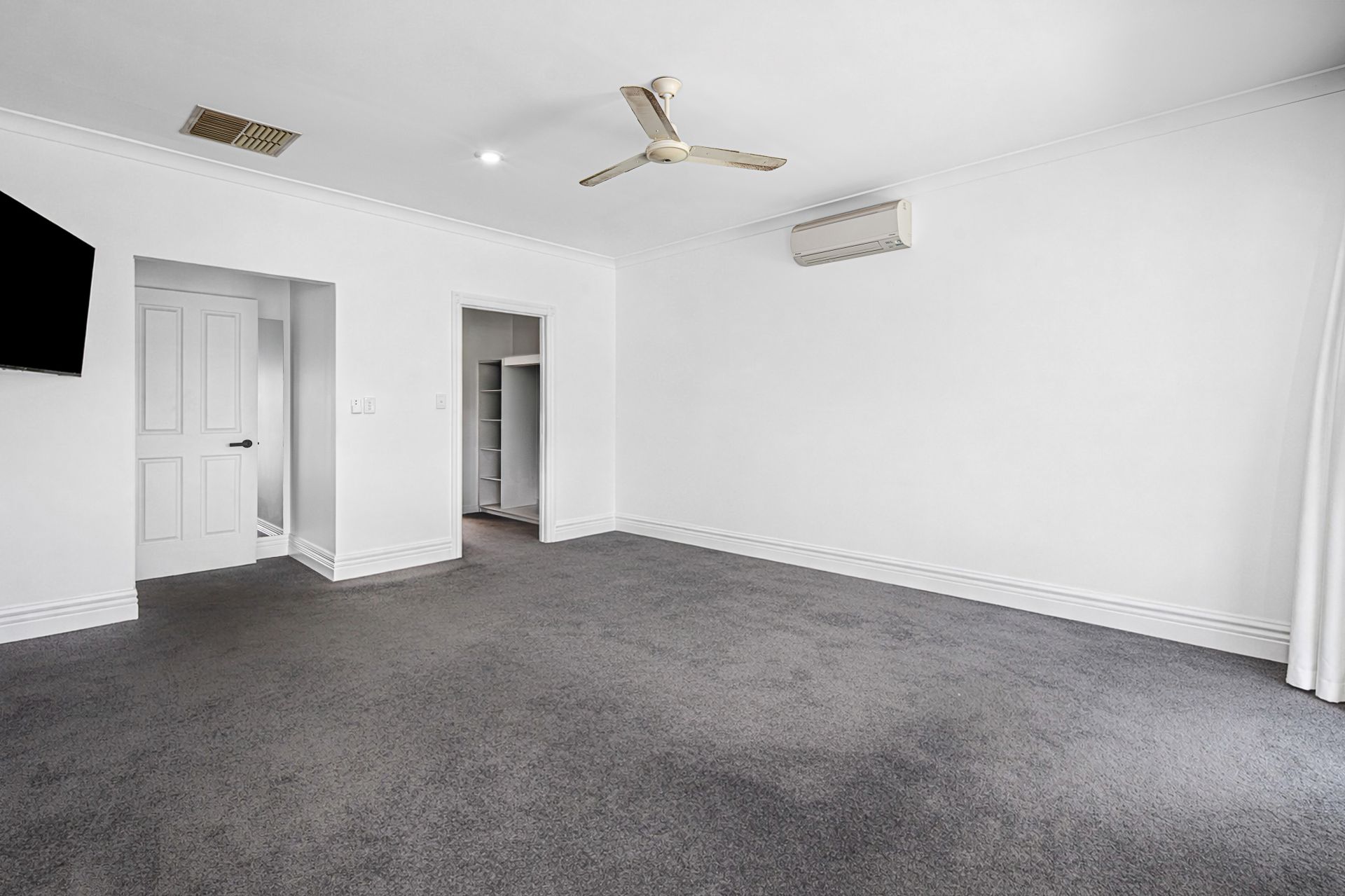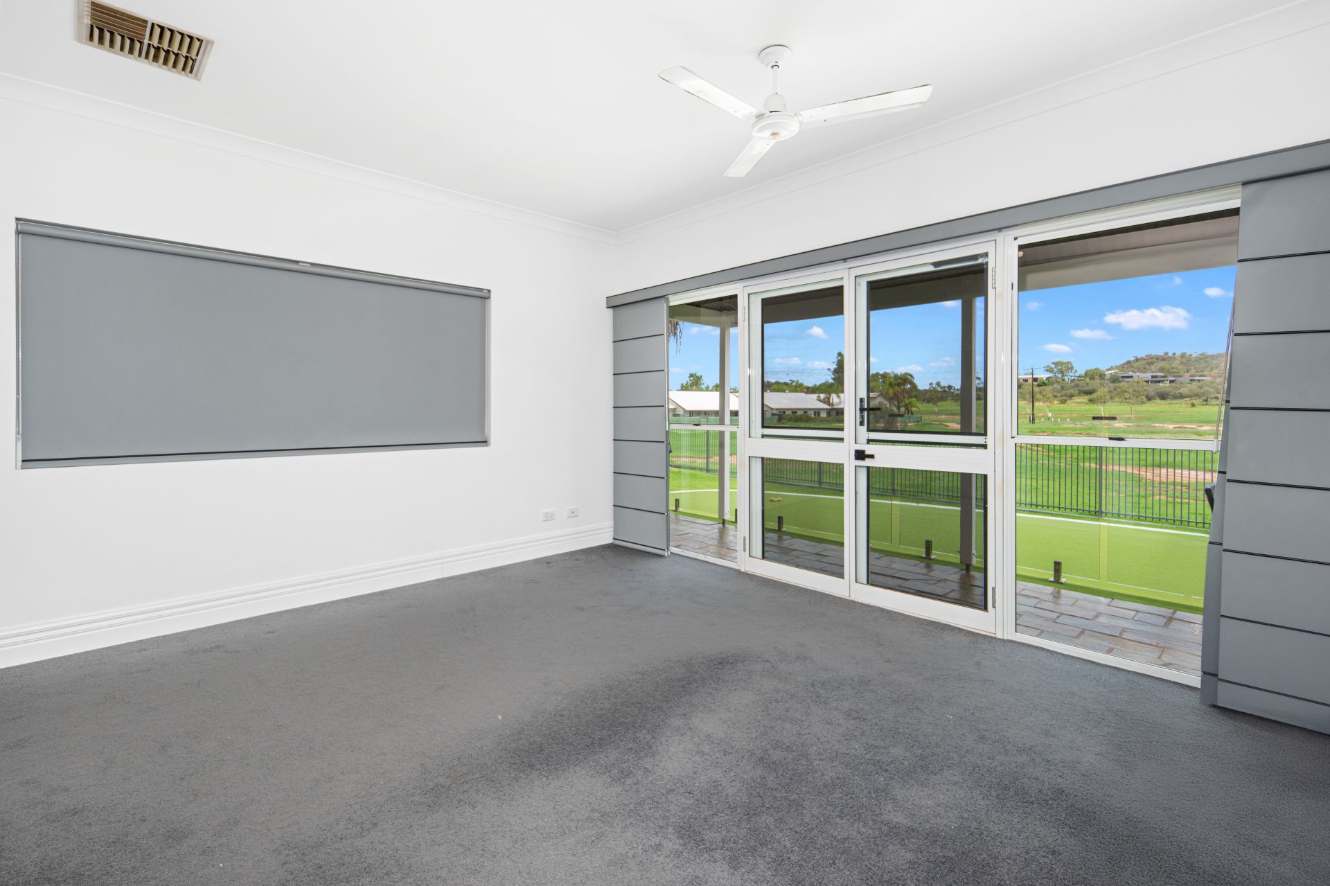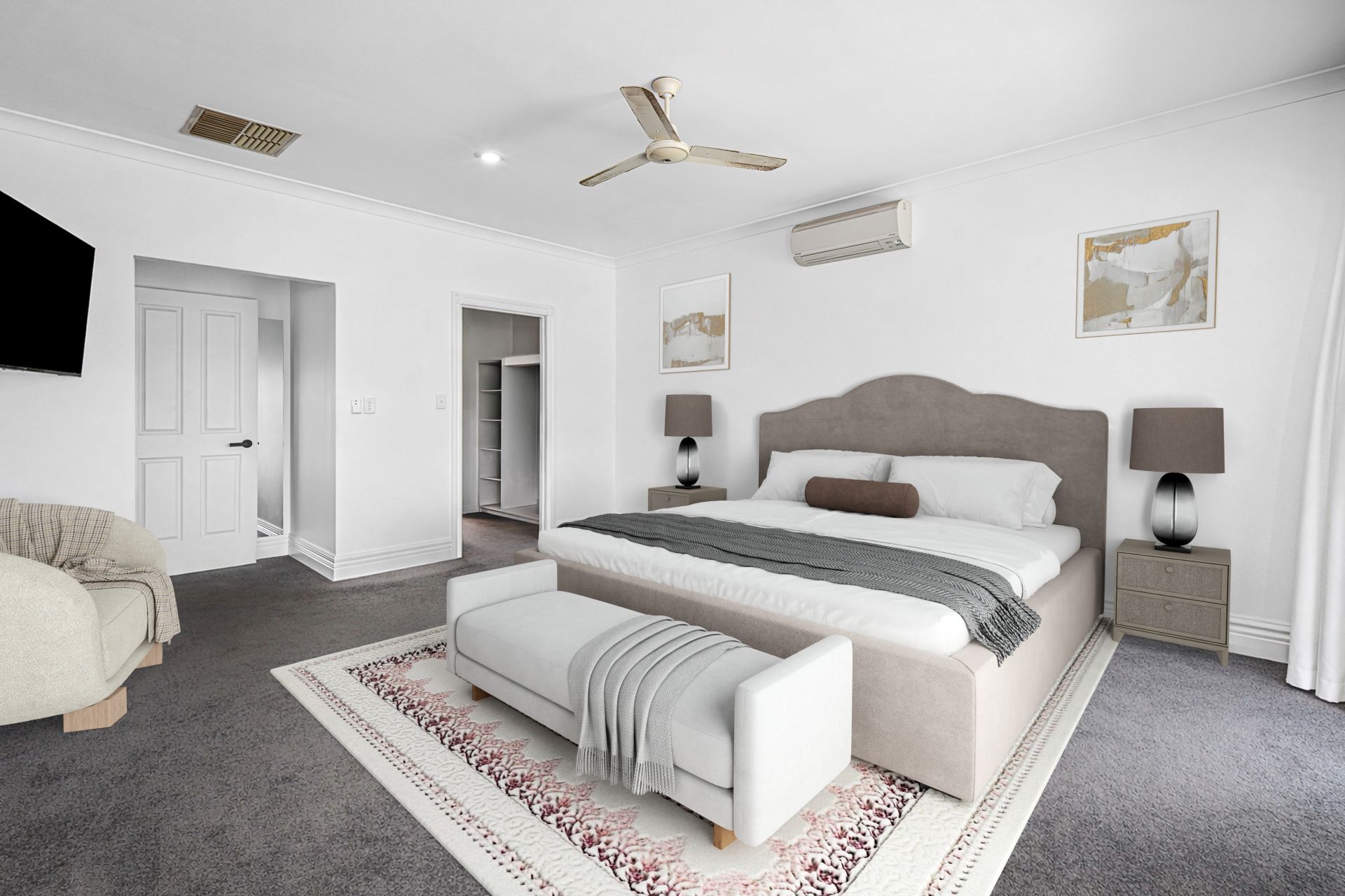 Upon entry, a wide and welcoming hallway sets the tone. To the left are the minor bedrooms, study, and the centrally located family bathroom, while to the right you’ll find an enormous formal lounge and dining area. This elegant space is carpeted for added comfort and opulence and is enhanced by double doors, making it ideal for entertaining or quiet retreat.