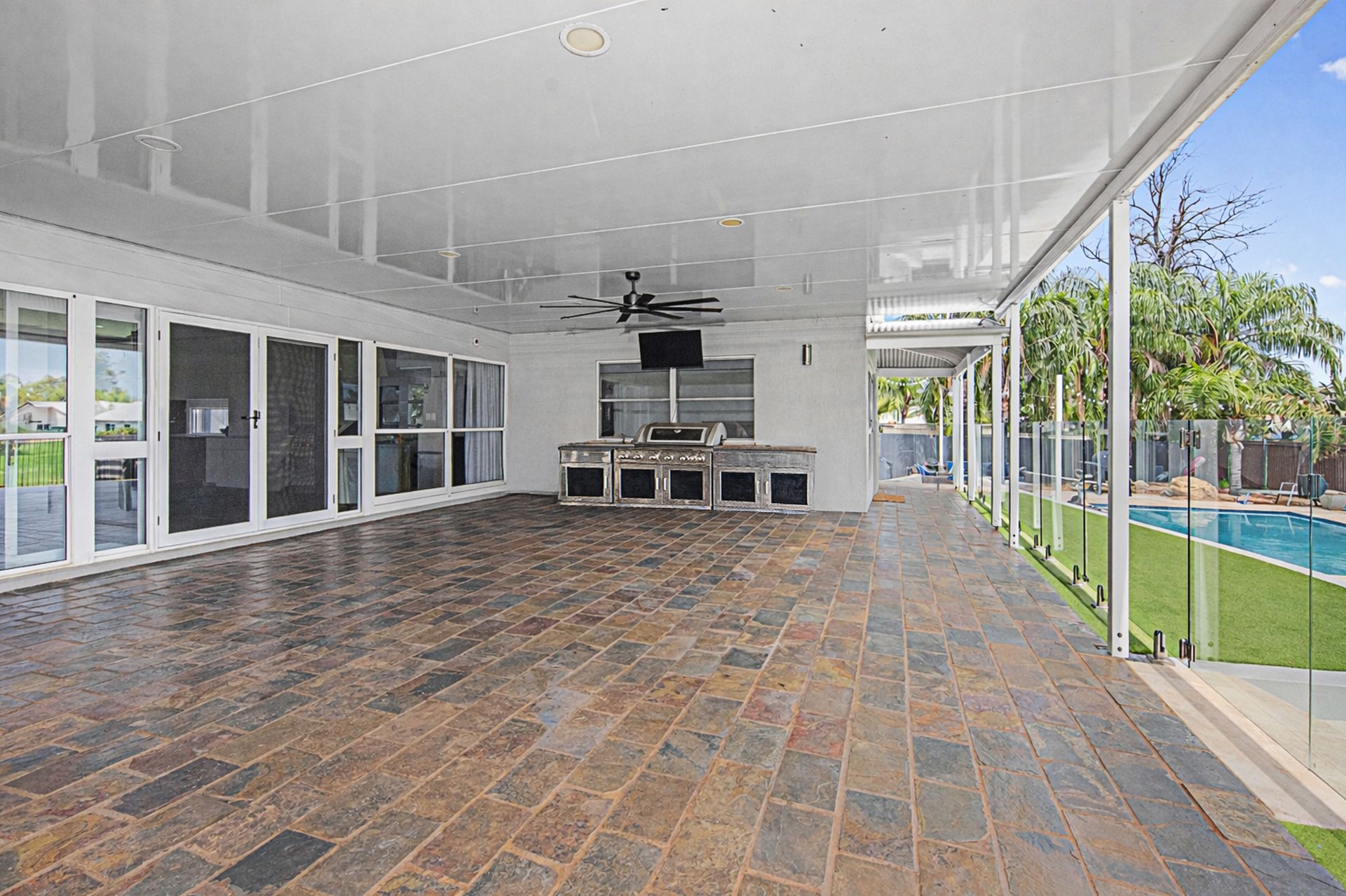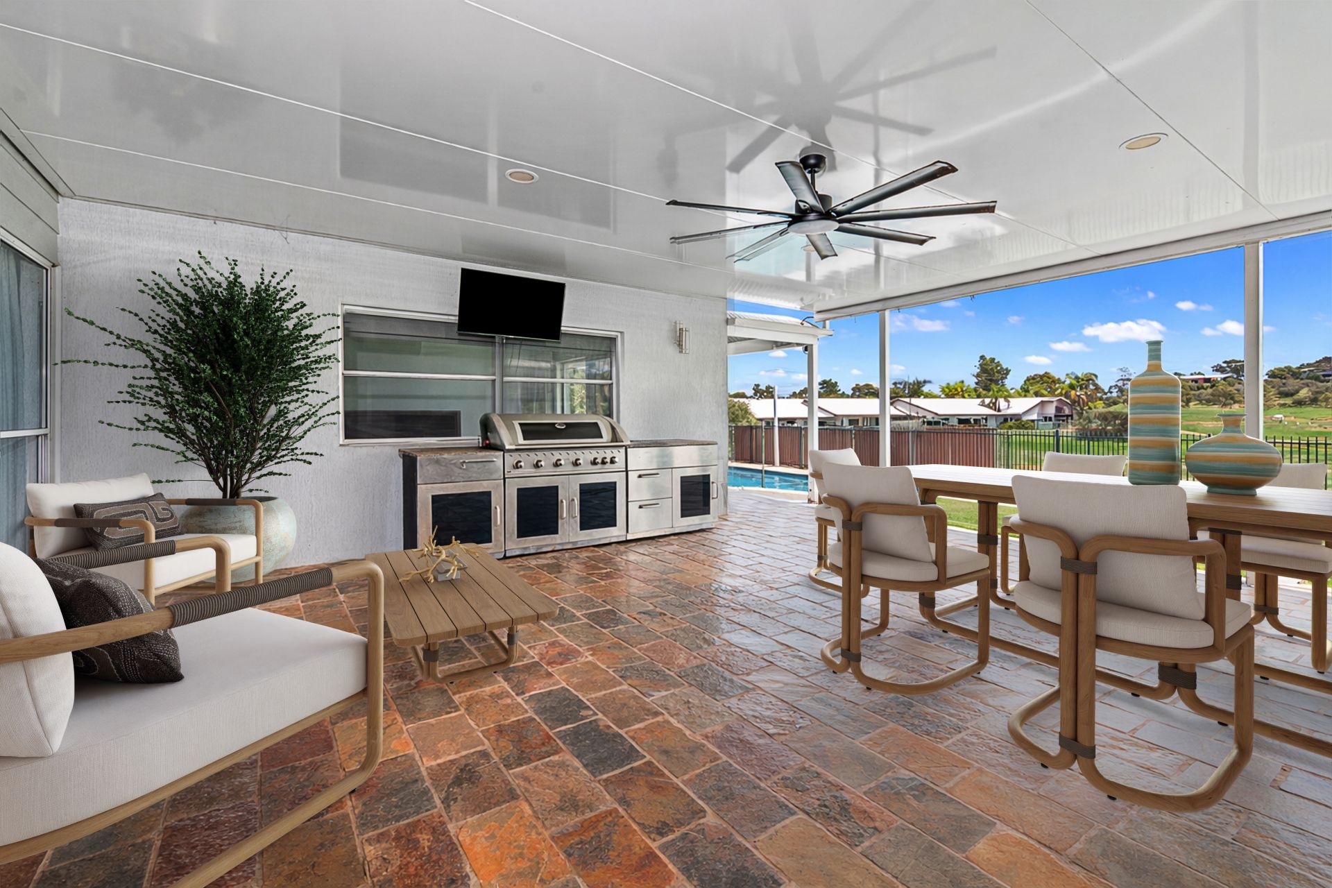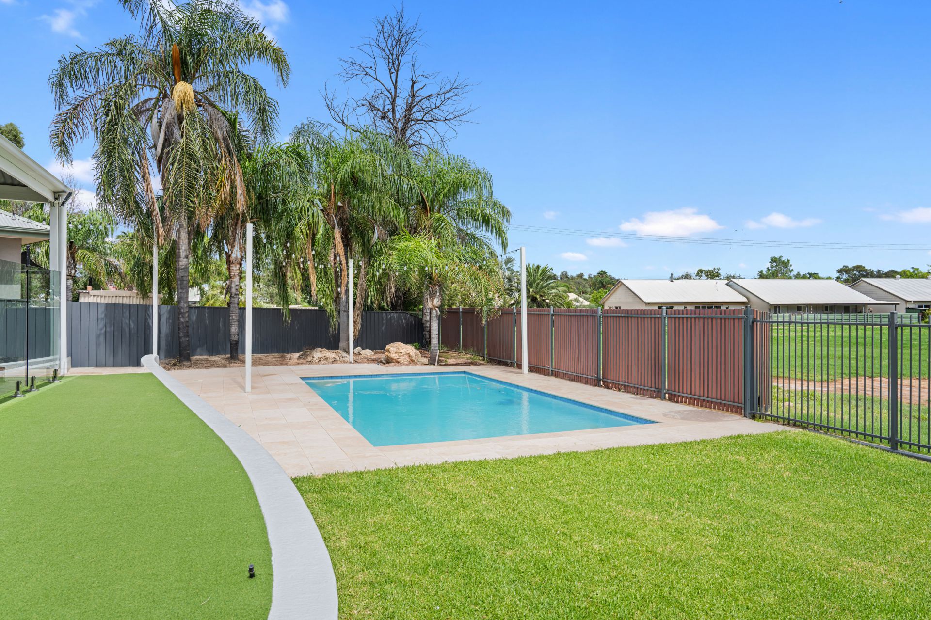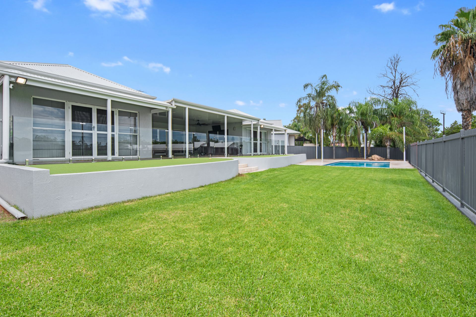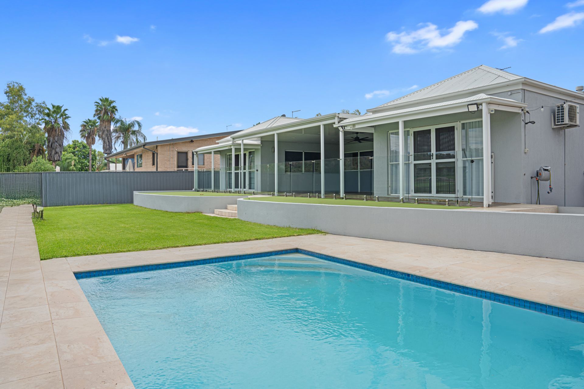 Positioned at either side of the rear wing are two large bedroom suites, each boasting luxurious renovated ensuites. Both suites enjoy direct access to the rear yard and the undercover entertaining area, creating a private and resort-style feel.