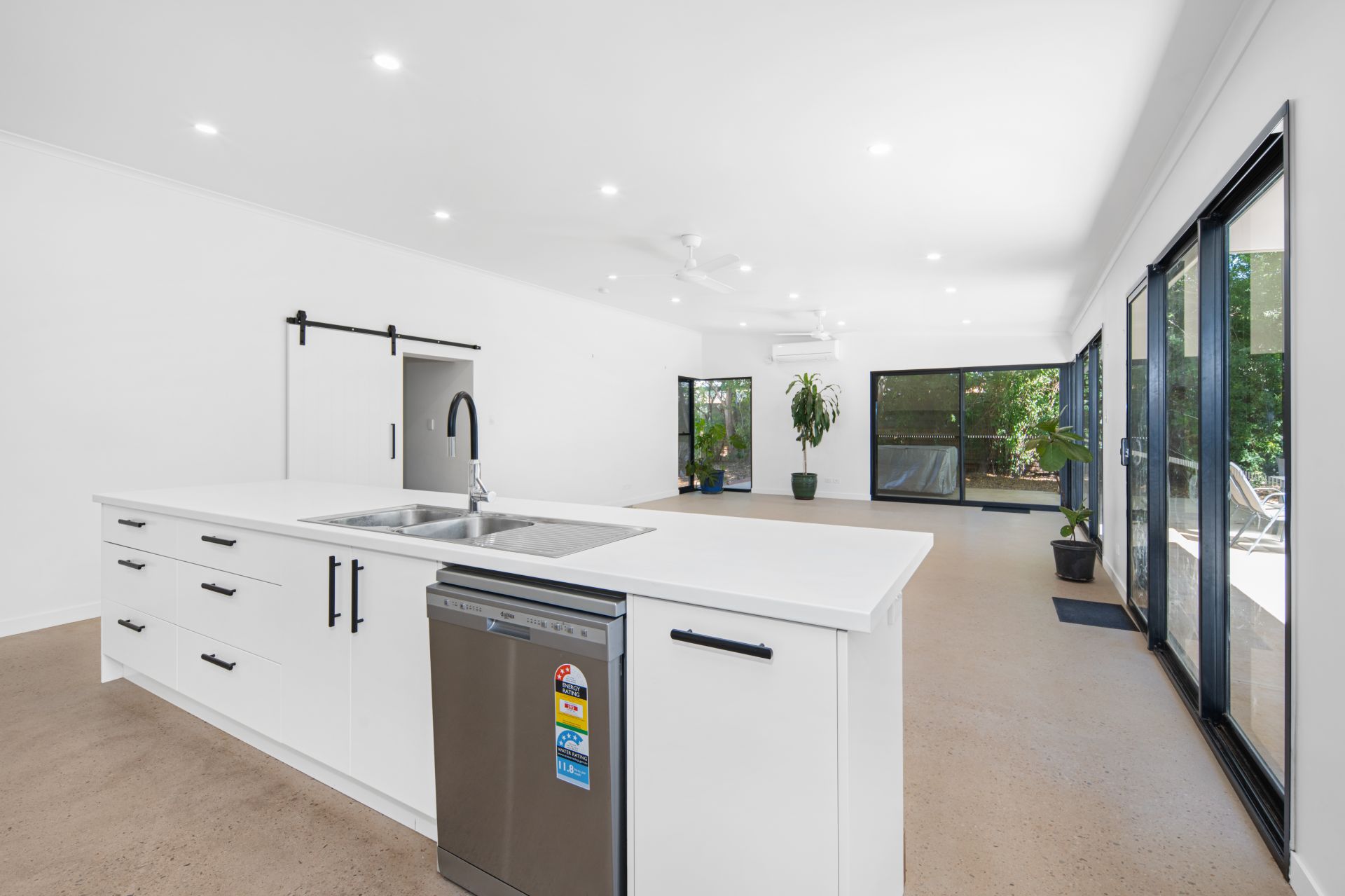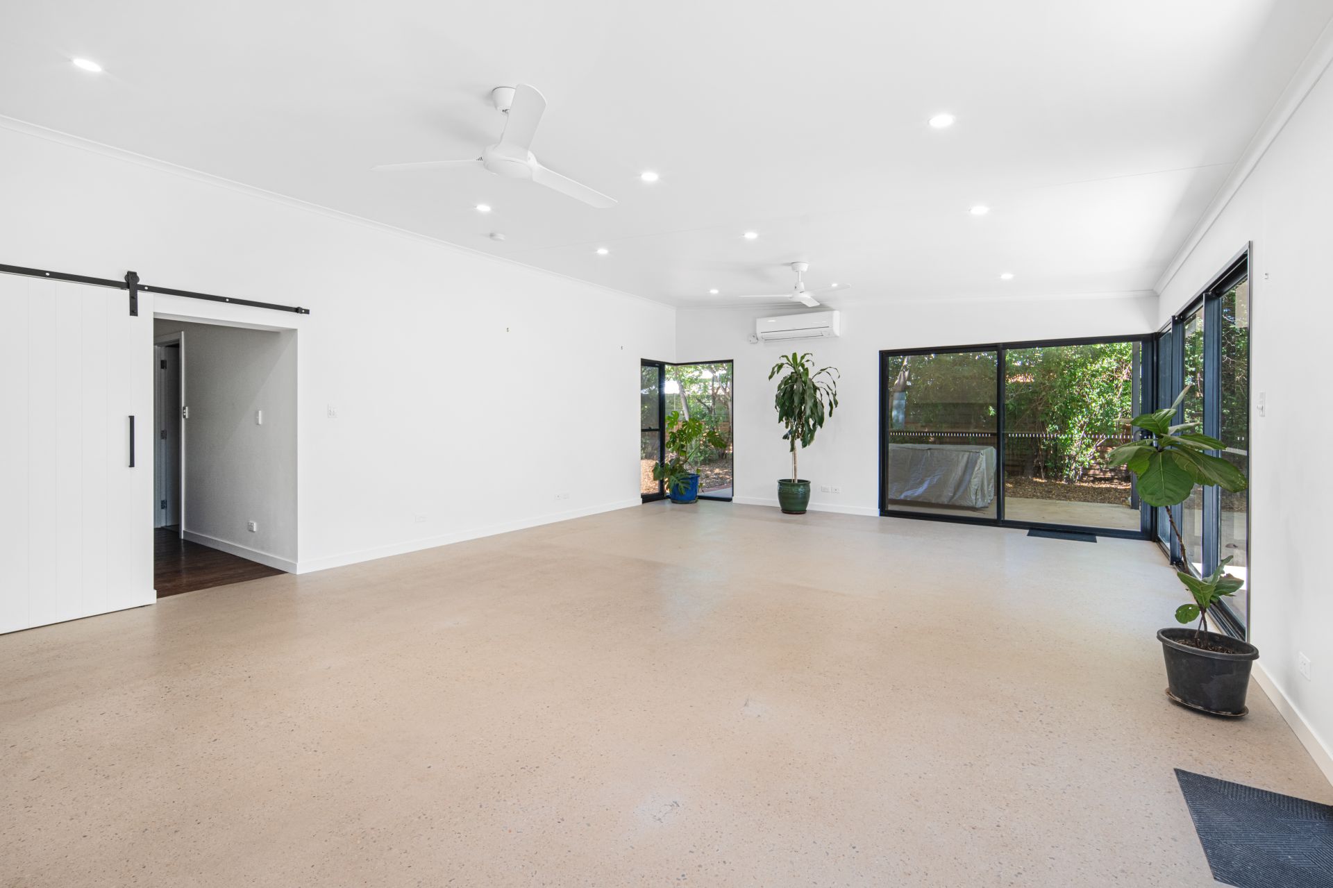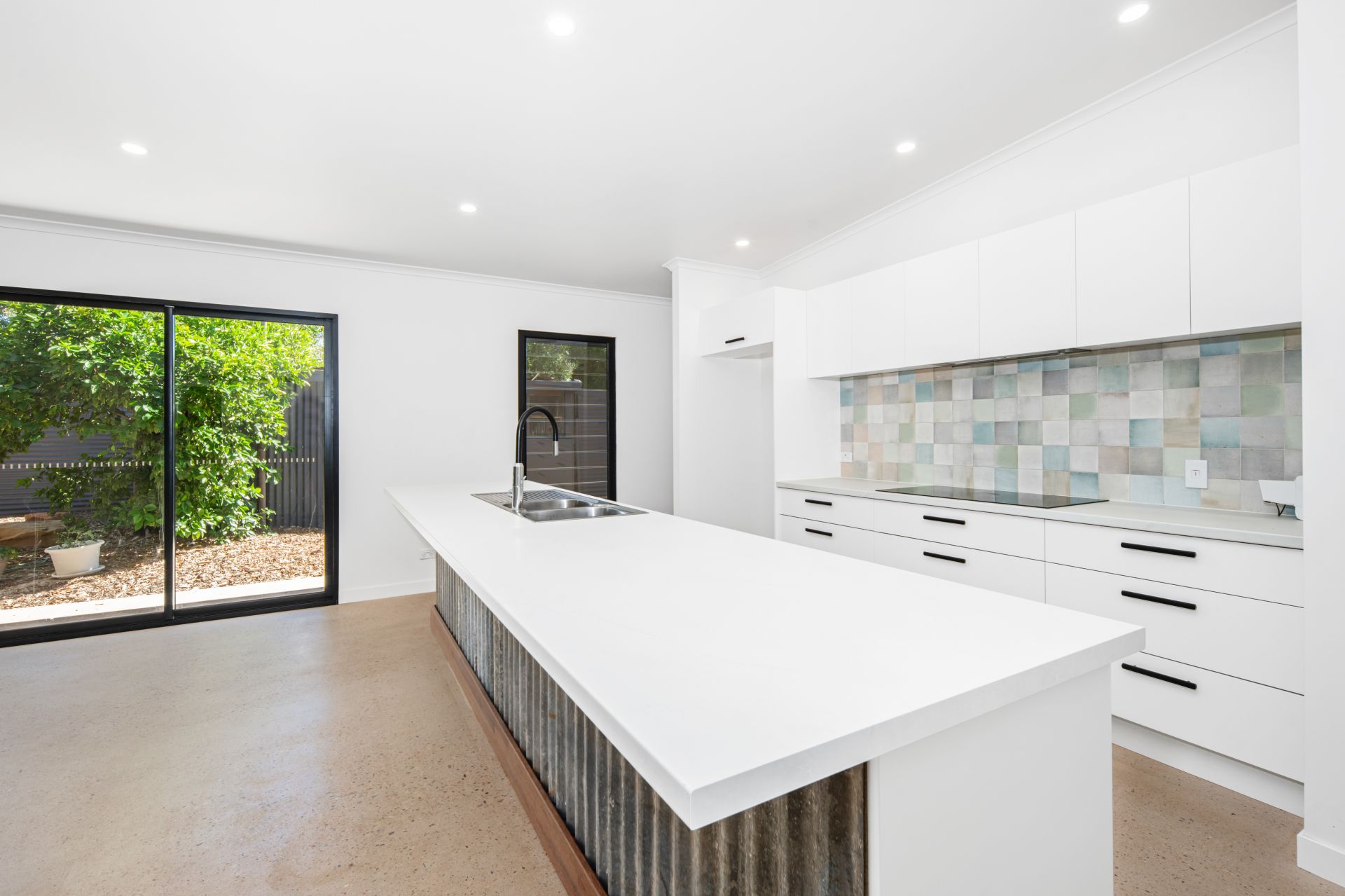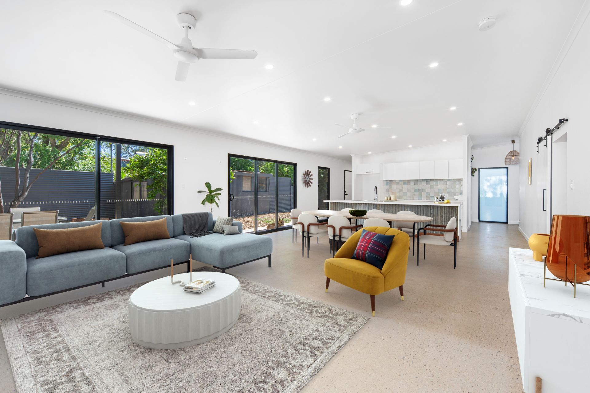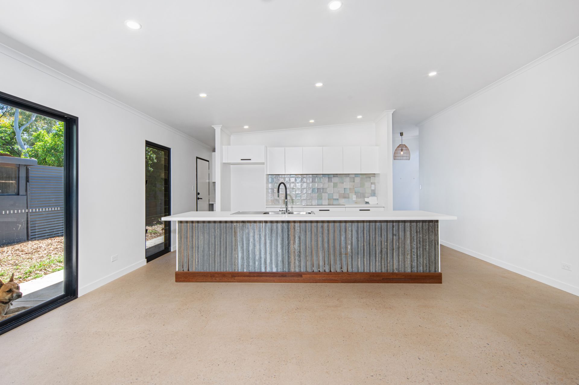 Light-filled open plan living, dining, and kitchen area with polished concrete floors
