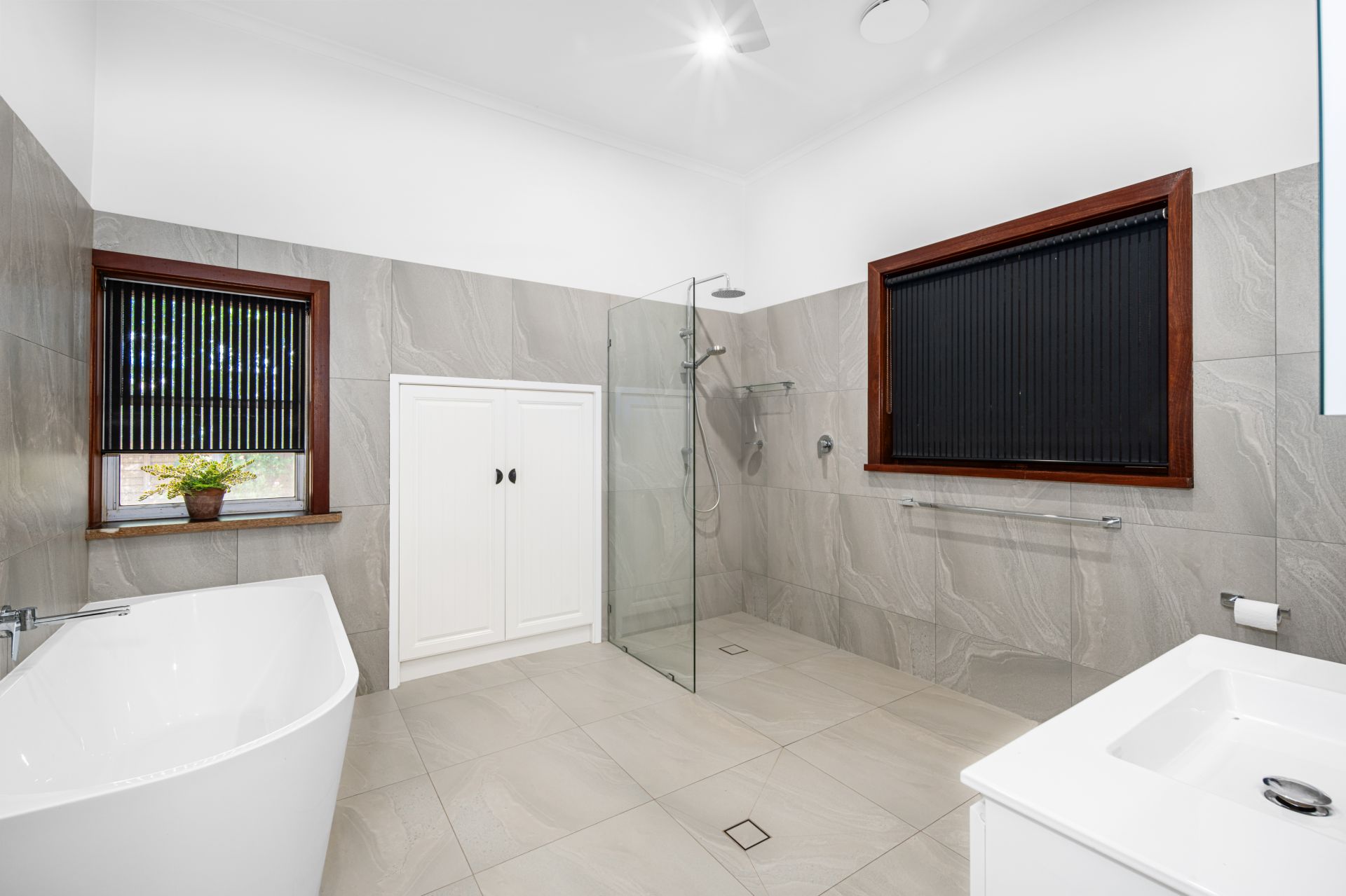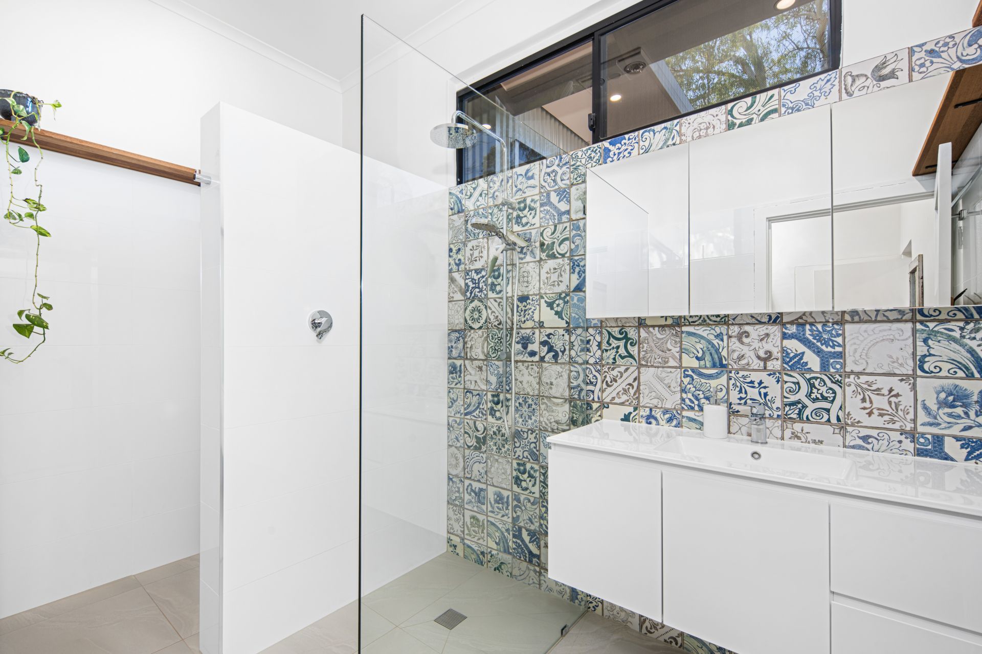 Timber flooring throughout bedrooms and hallway, complemented by chic tiling in bathrooms