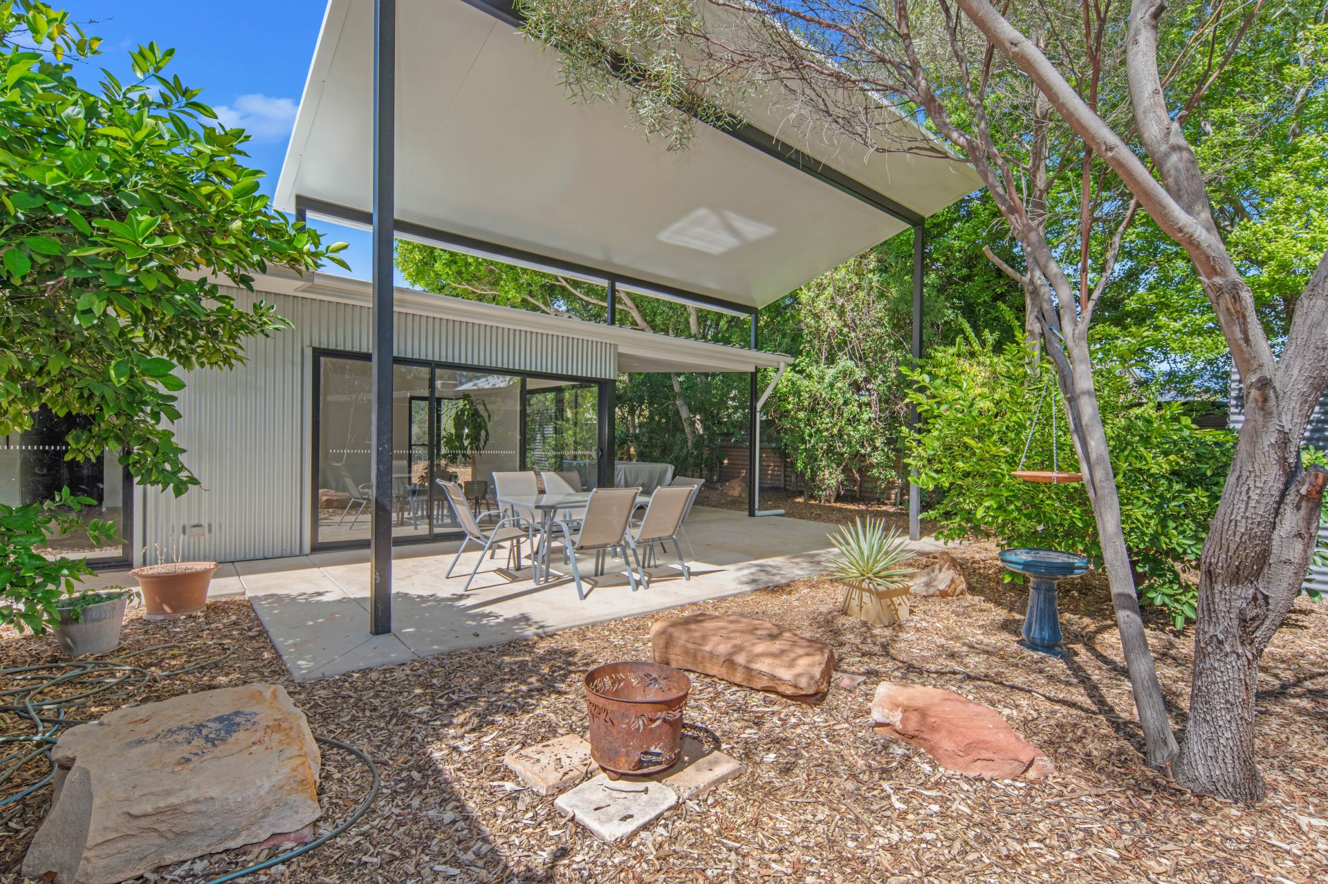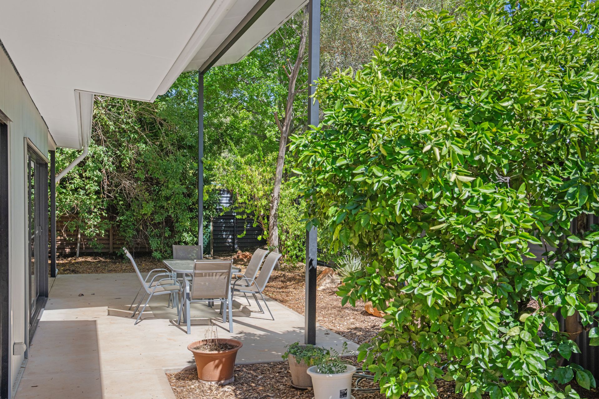 Covered outdoor entertaining area overlooking low-maintenance native gardens