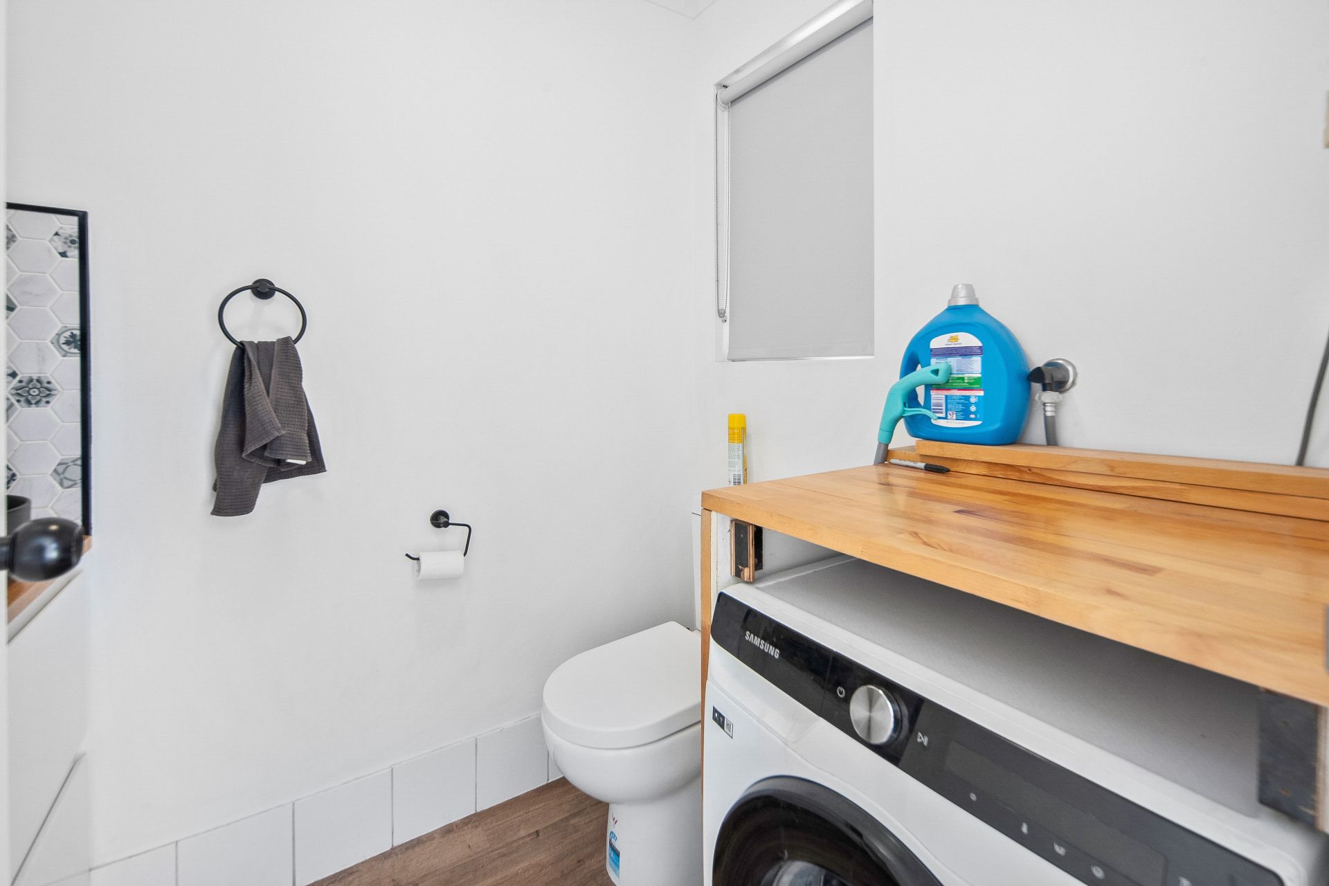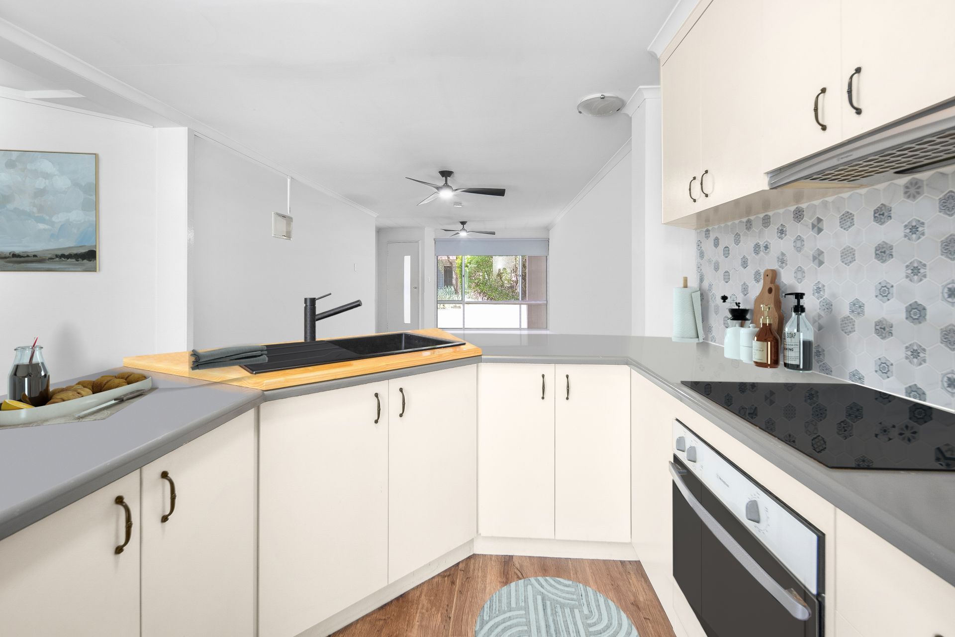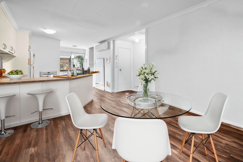 Step into a spacious, open-plan living area, designed for relaxation. The room is inviting with vinyl planking, while the modern kitchen offers ample storage and a sleek island bench that doubles as a functional breakfast bar, ideal for casual meals or social gatherings.