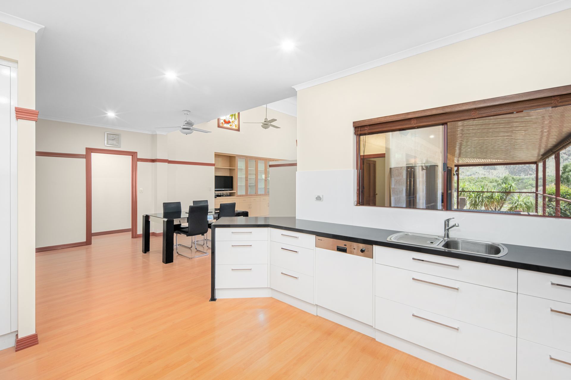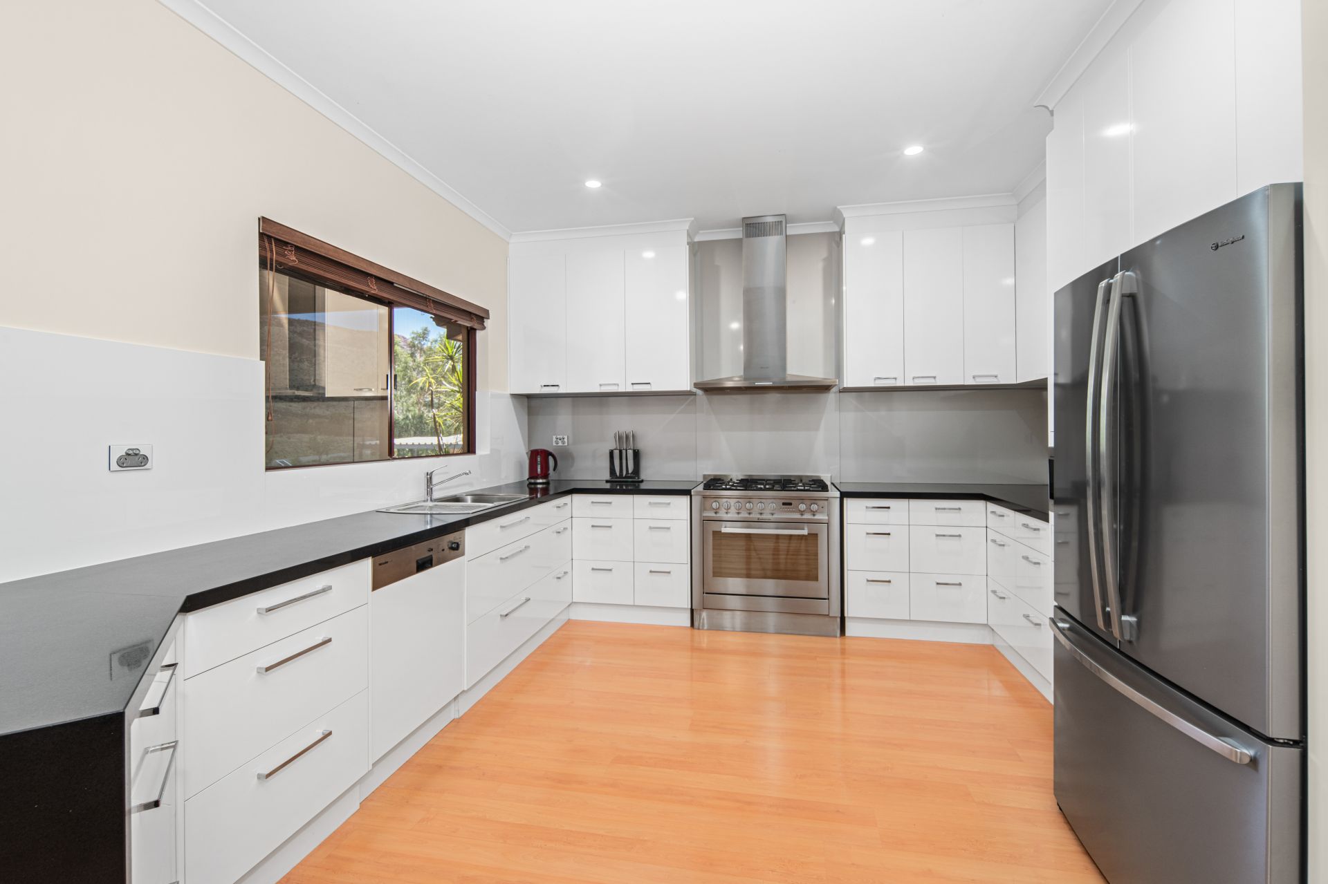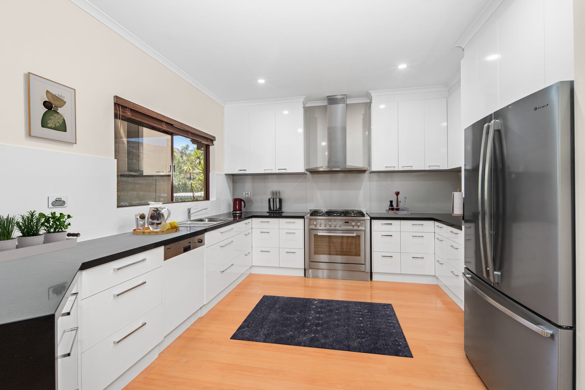Inside, the expansive living and dining zones offer room for everyone to spread out, while the well-appointed kitchen is designed for those who love to cook. It features a 5-burner gas cooktop, electric oven, double stainless-steel sink, dishwasher, built-in microwave, excellent bench space, abundant cabinetry and a separate pantry.