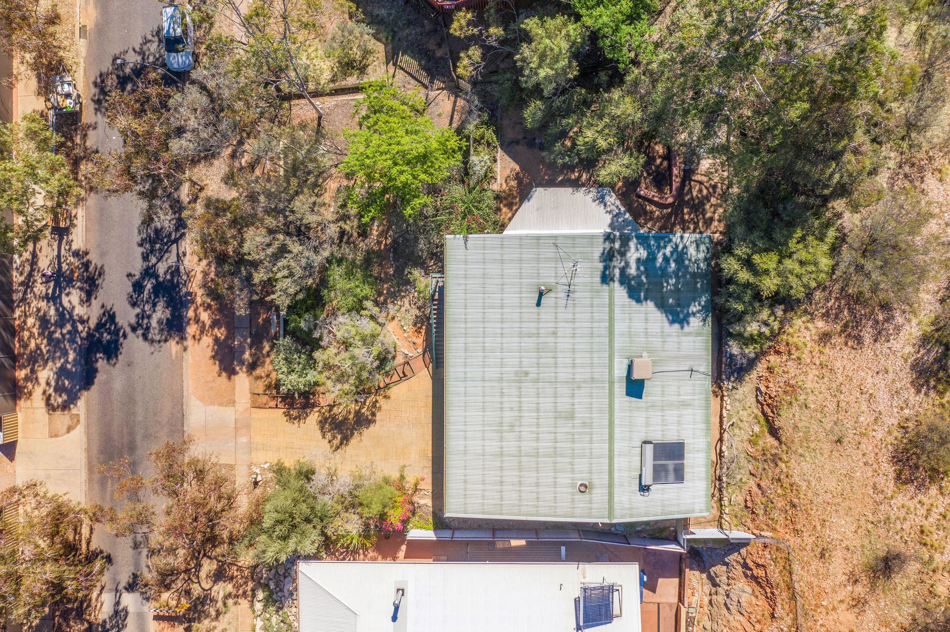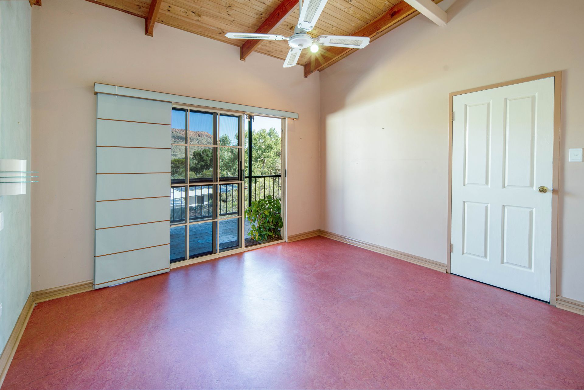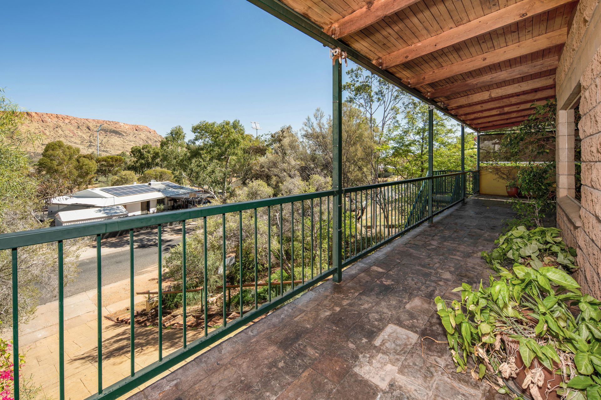 Upstairs, a full-length balcony stretches across the home, framing some of the most spectacular views of the MacDonnell Ranges. Step inside to an open-plan living area highlighted by slate flooring and raked ceilings, creating a sense of space and character. The expansive living zone is complemented by a combustion heater and elegant French doors that open onto a generous rear deck-perfect for entertaining or simply soaking up the peaceful surrounds.