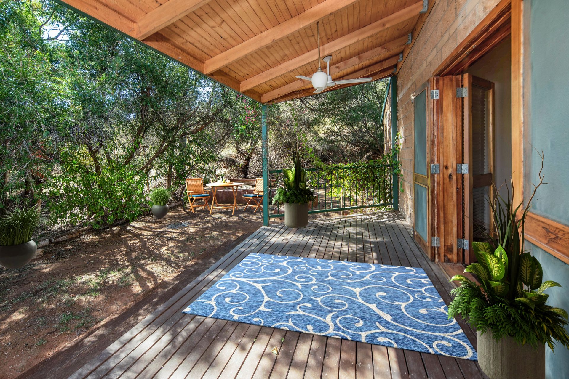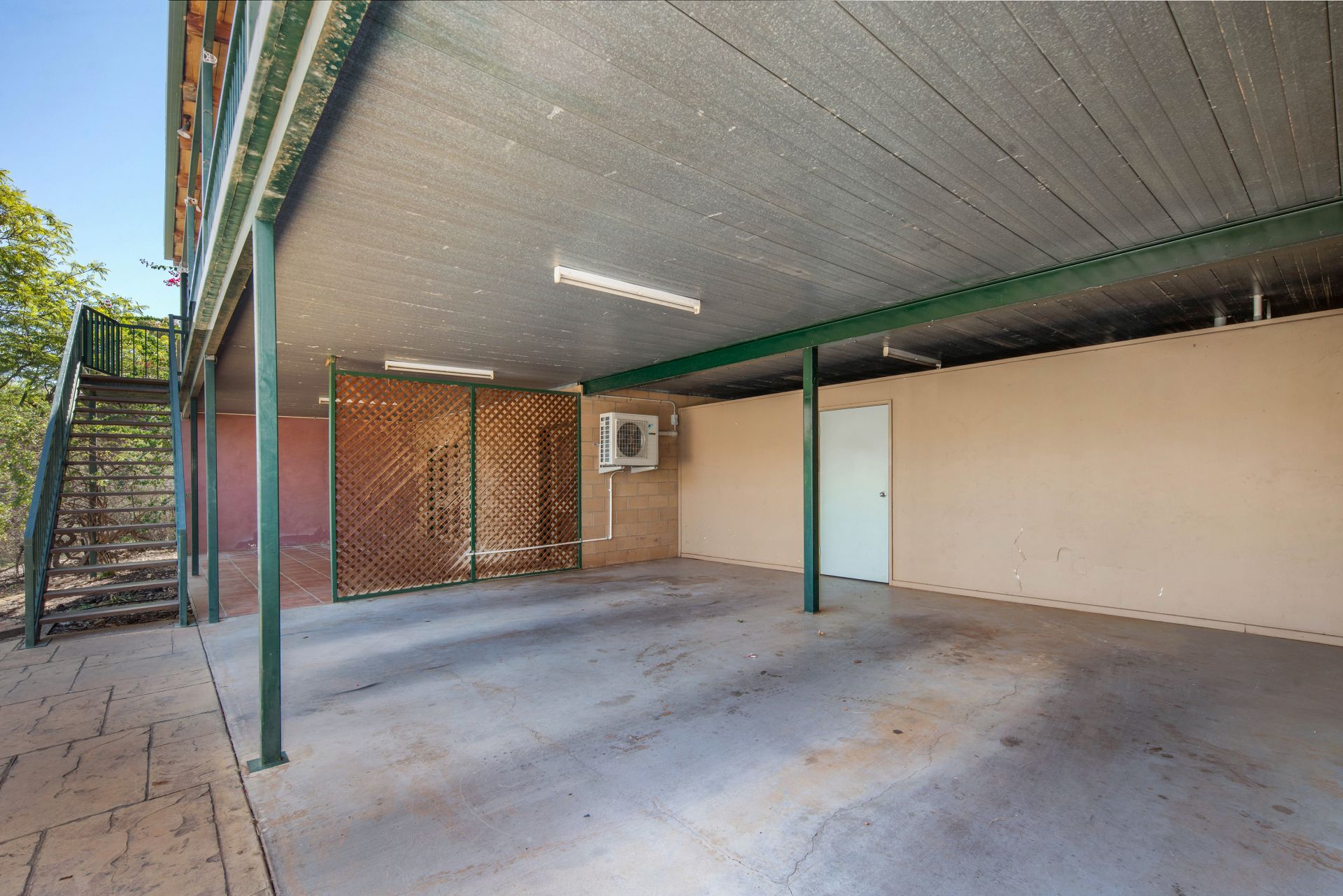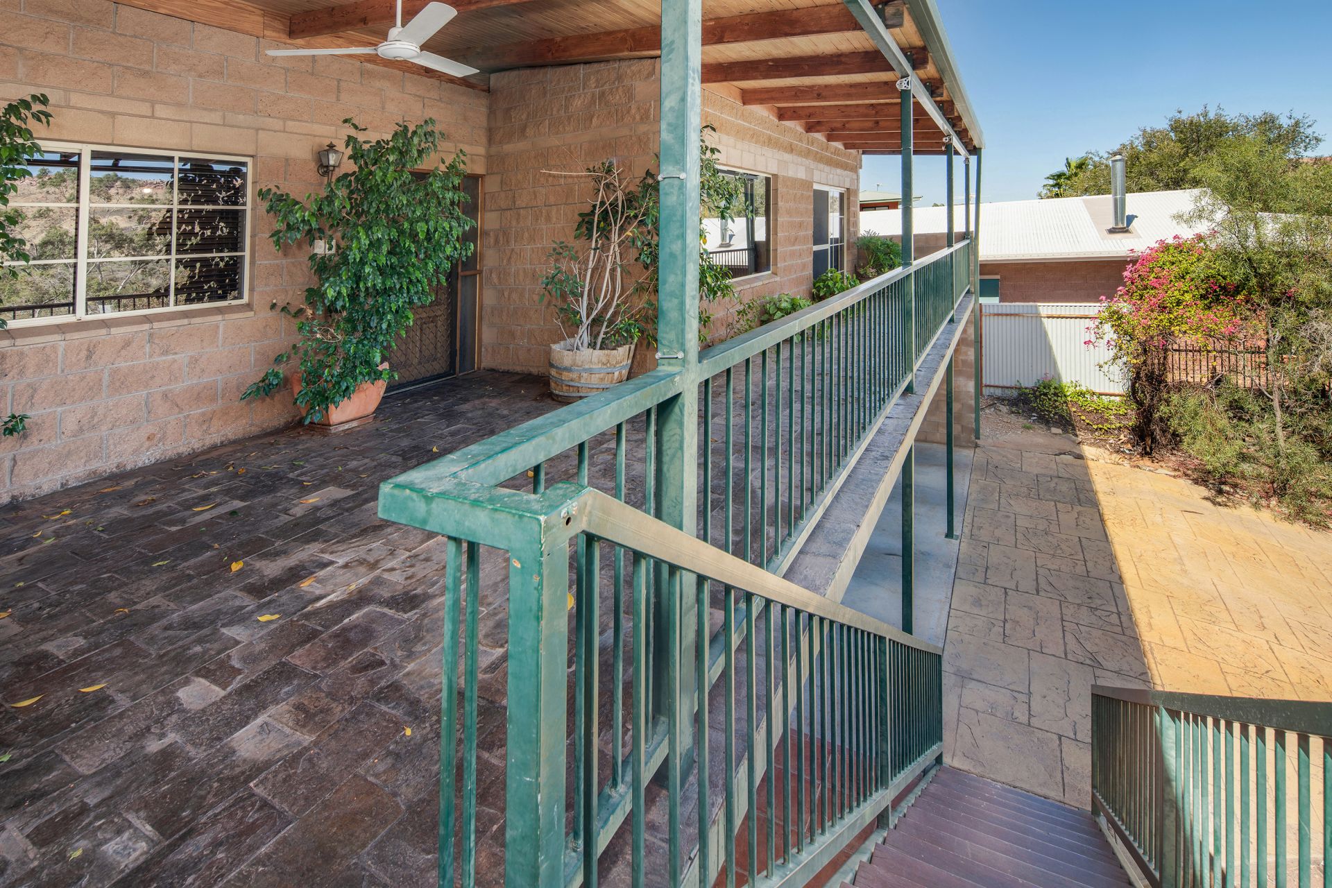 Upstairs, a full-length balcony stretches across the home, framing some of the most spectacular views of the MacDonnell Ranges. Step inside to an open-plan living area highlighted by slate flooring and raked ceilings, creating a sense of space and character. The expansive living zone is complemented by a combustion heater and elegant French doors that open onto a generous rear deck-perfect for entertaining or simply soaking up the peaceful surrounds.