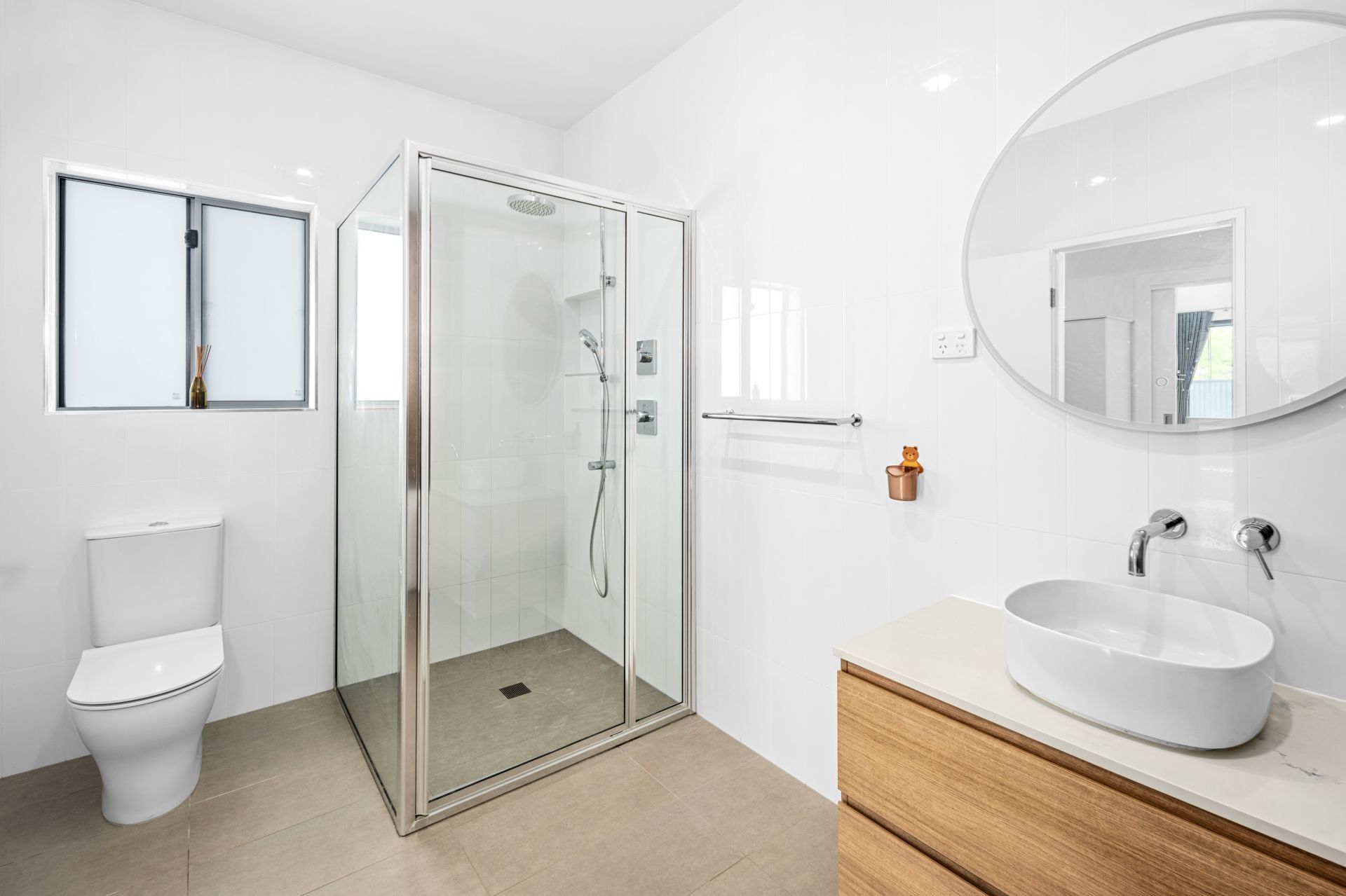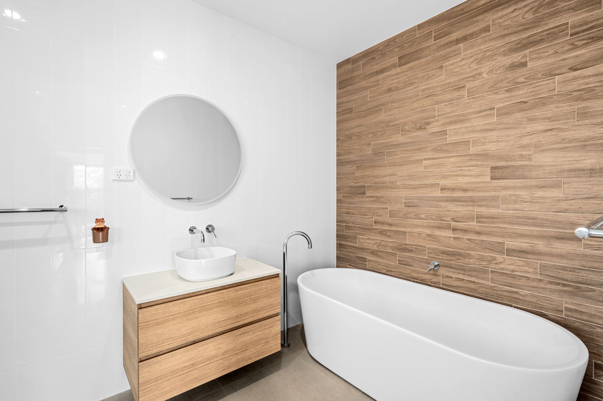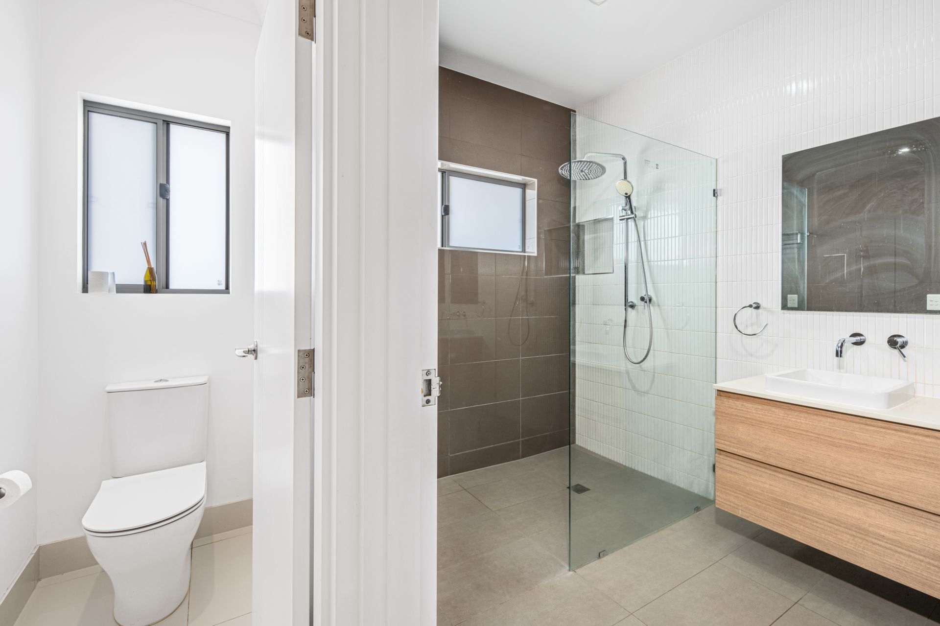The master bedroom is a true retreat, featuring a generous walk-through robe that flows seamlessly into a beautifully appointed ensuite. The ensuite includes a full-sized bath, separate shower, vanity, WC, and striking floor-to-ceiling tiling for a touch of luxury.