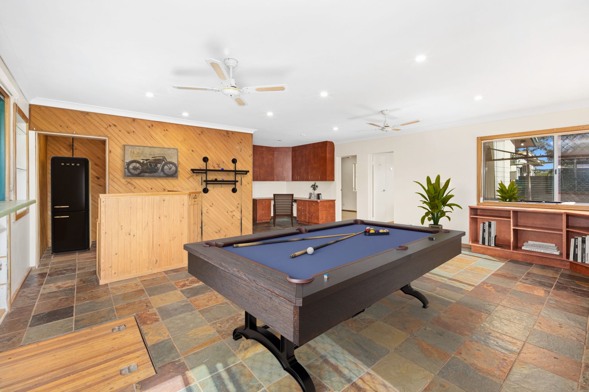 At the rear of the home is a huge second family room, ideal for entertaining. Complete with built-in cabinetry, a bar, concertina windows, and a large cellar, this space is perfectly suited for hosting gatherings or relaxing with friends and family.