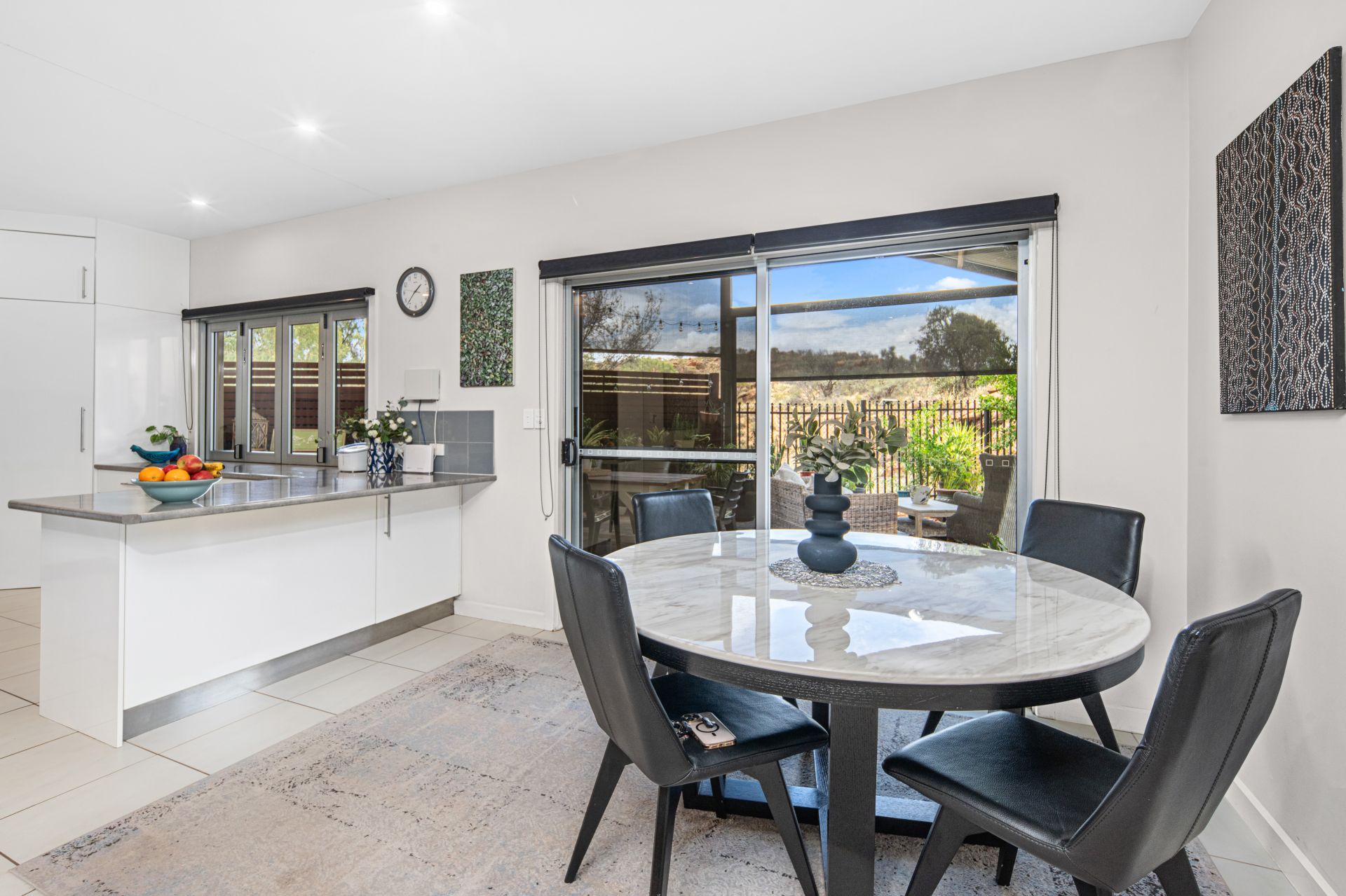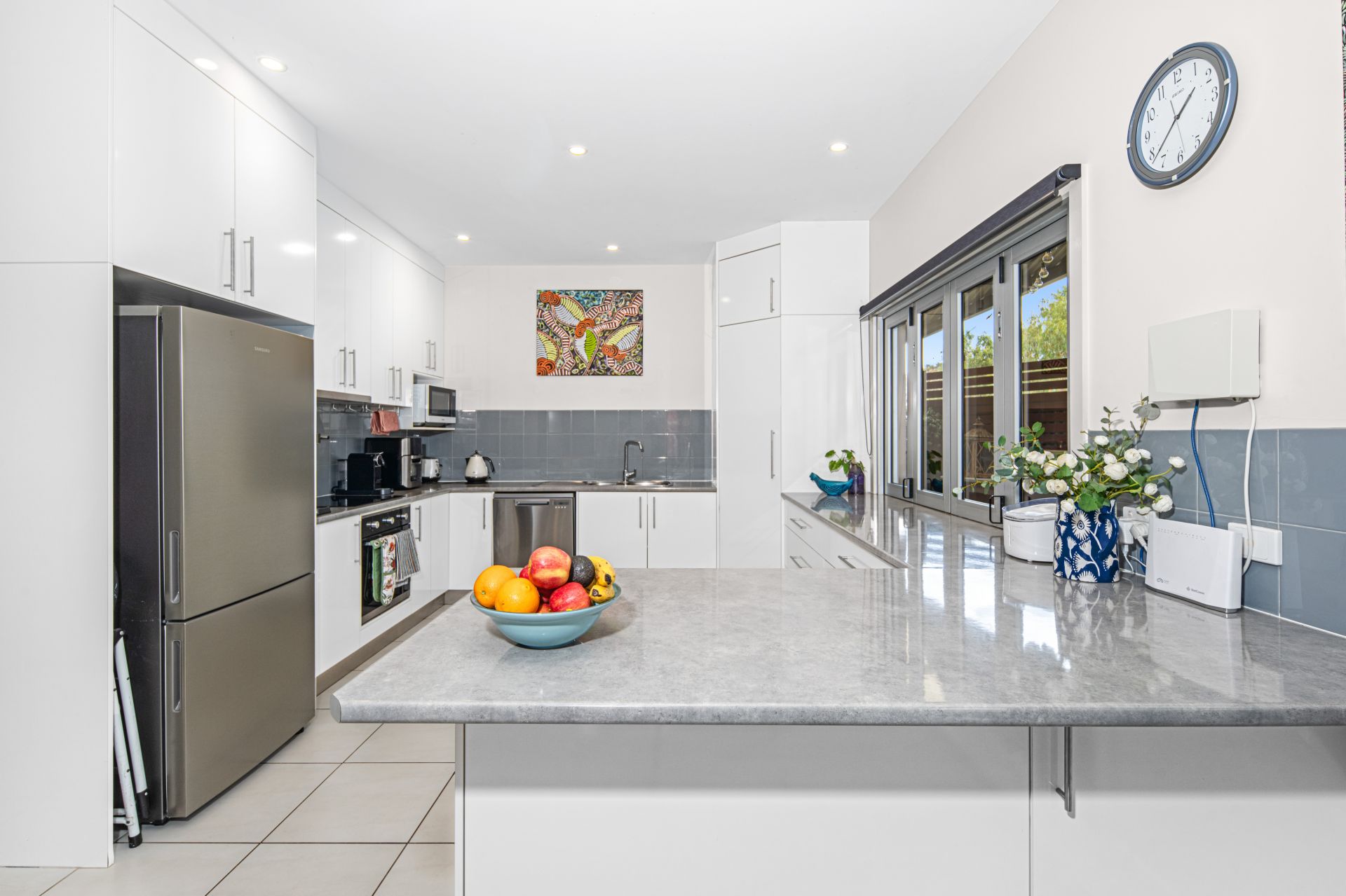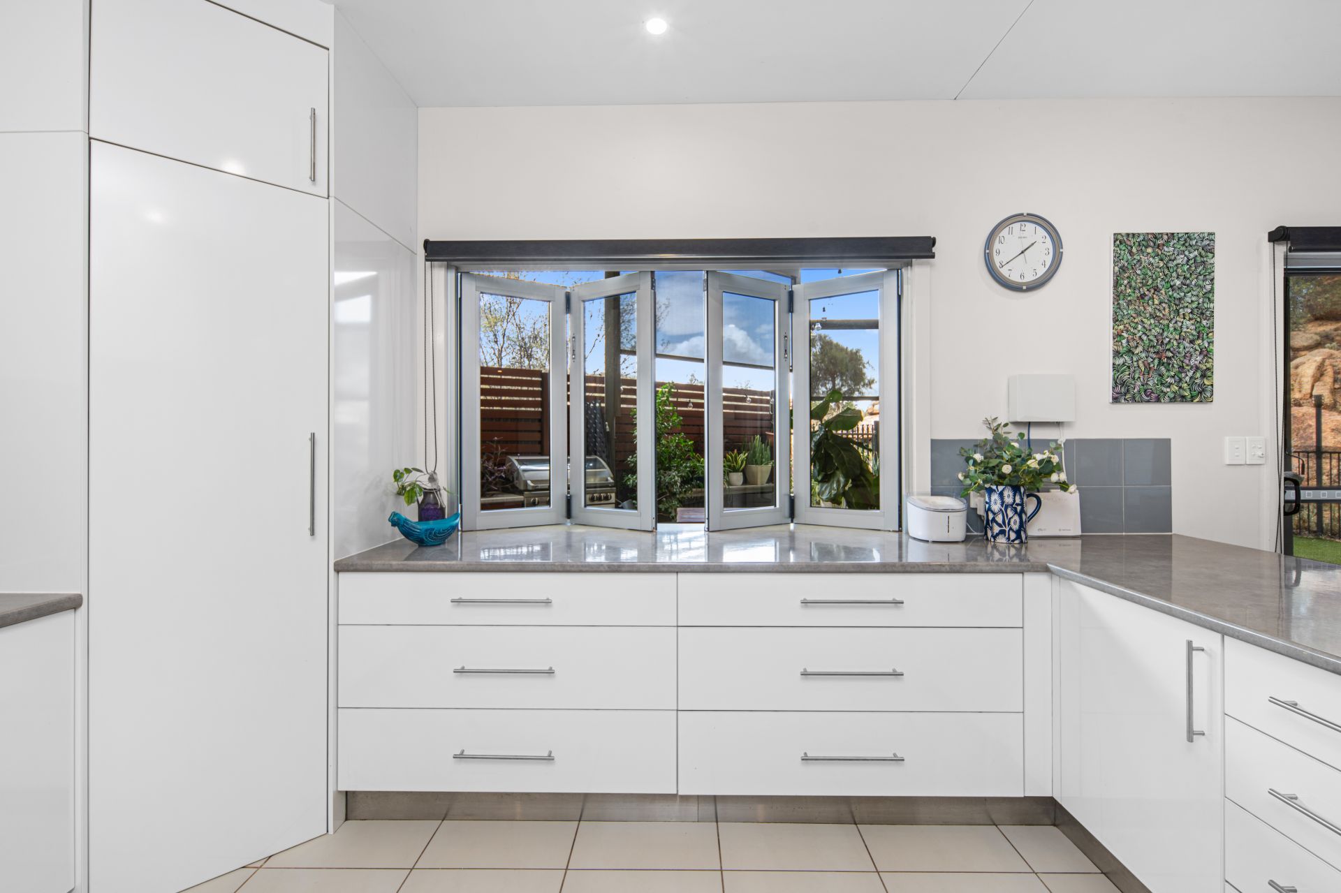 The well-appointed kitchen features induction cooking, a dishwasher, pantry, generous bench and cupboard space, and a breakfast bar. Bi-fold windows open to the outdoor area, seamlessly connecting indoor and outdoor living.