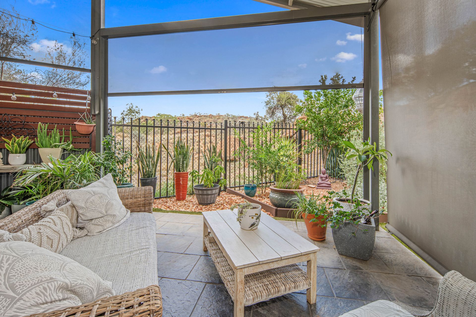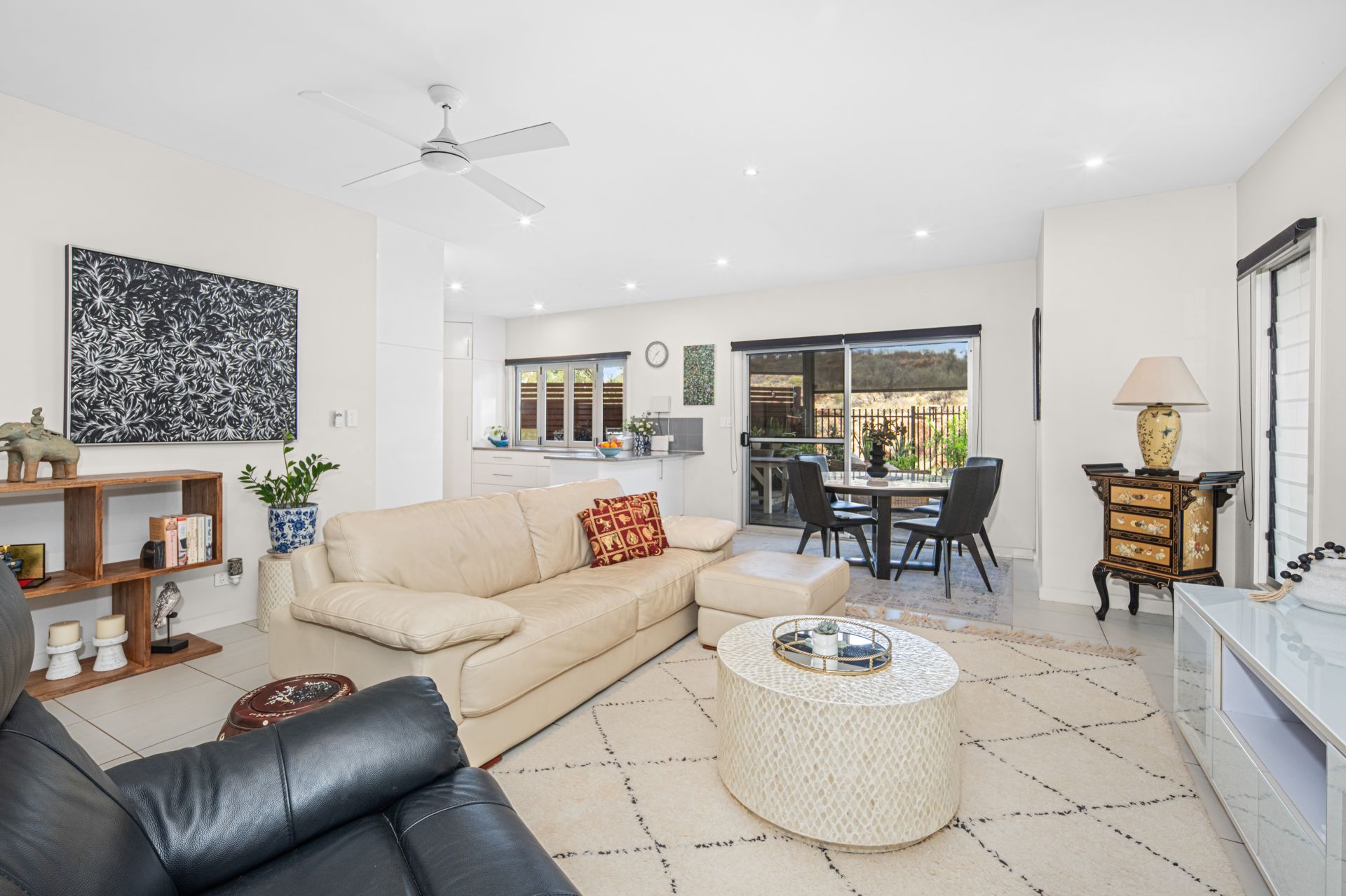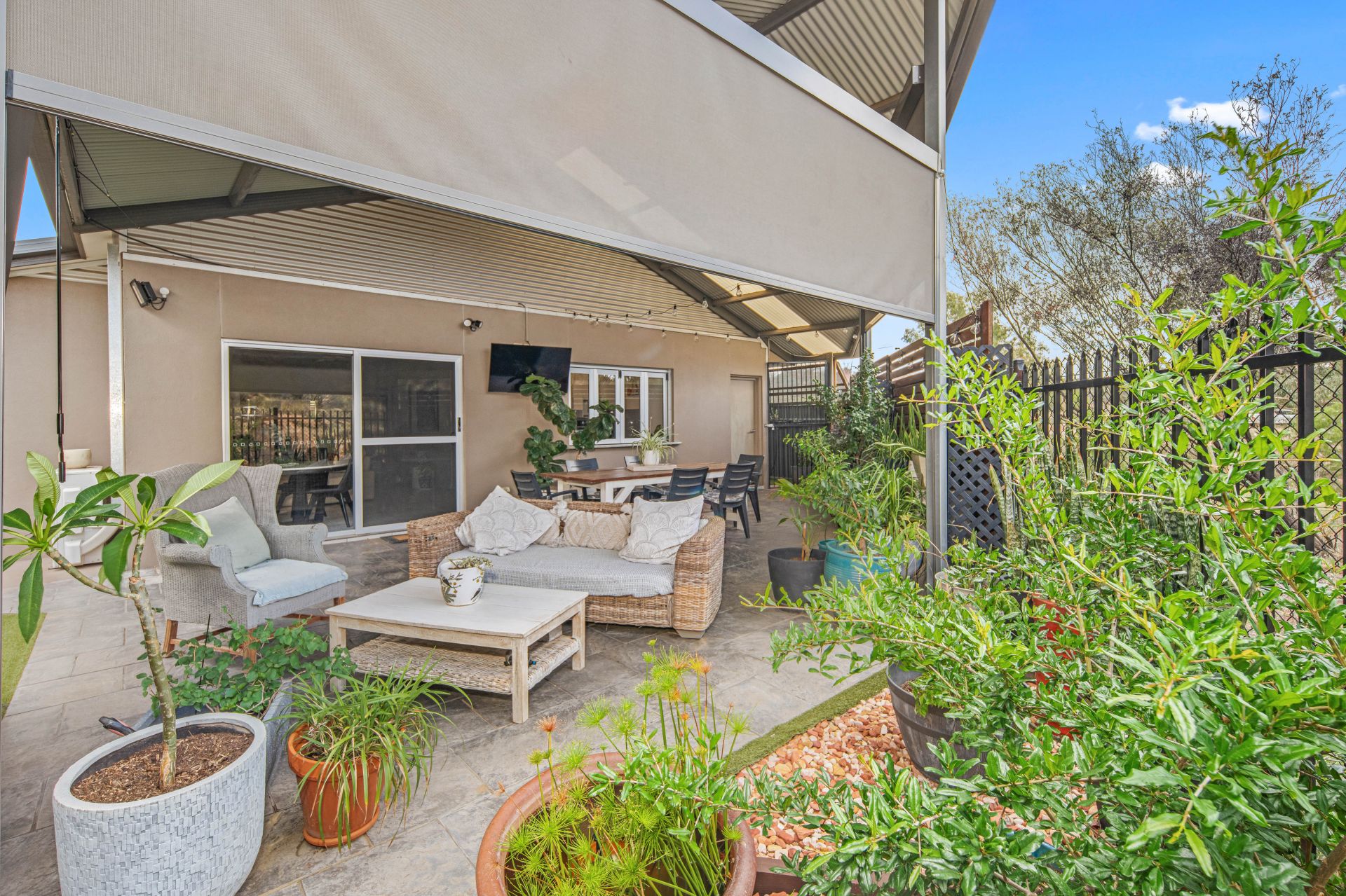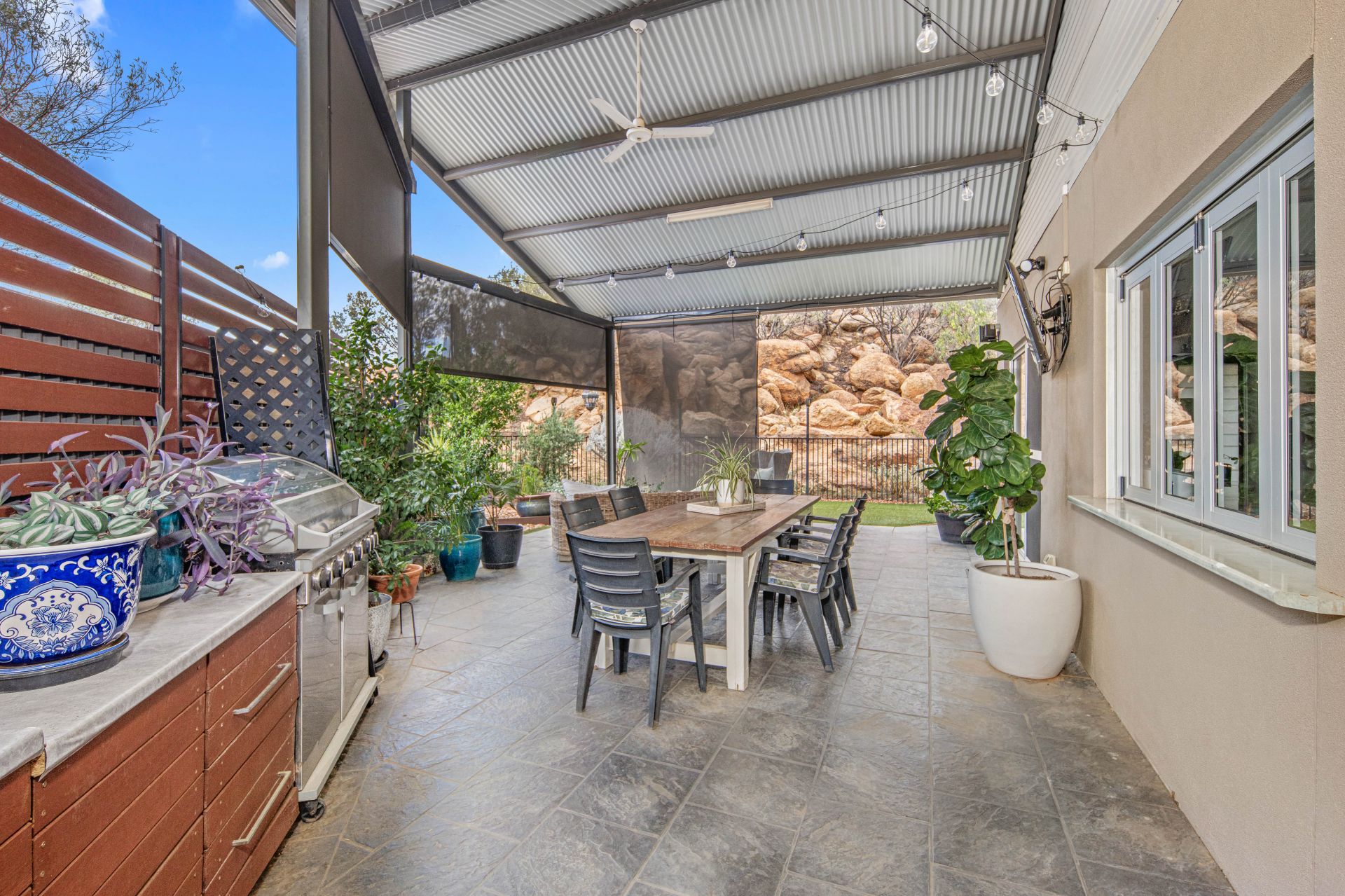 The open-plan living, dining and kitchen area flows effortlessly onto the undercover entertaining space, fitted with pull-down shades, ceiling fans and chic paving-perfect for year-round relaxation or hosting a barbecue with friends. There is also a separate storage room, sensor lighting and two garden sheds for added convenience.