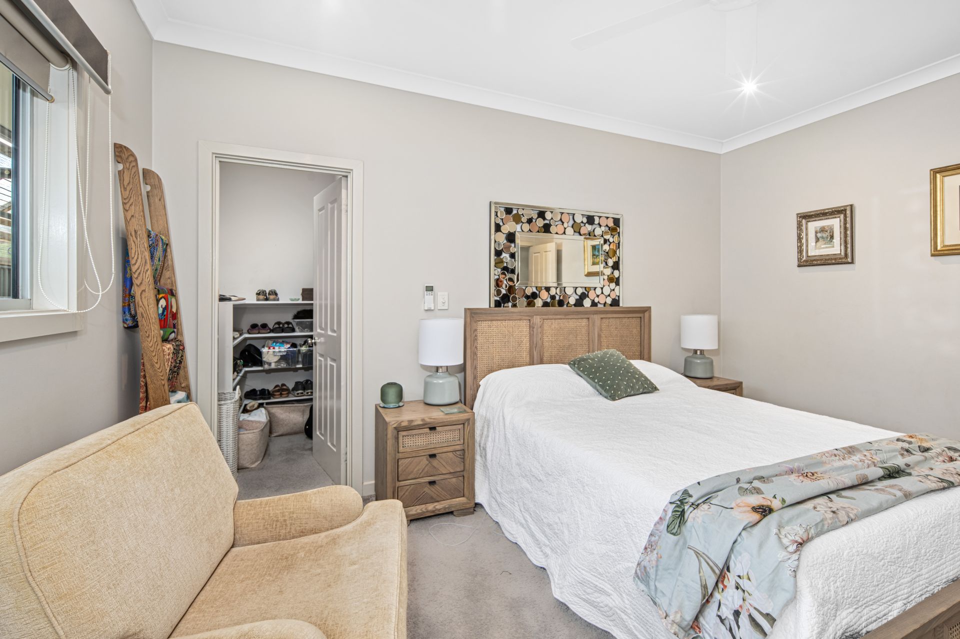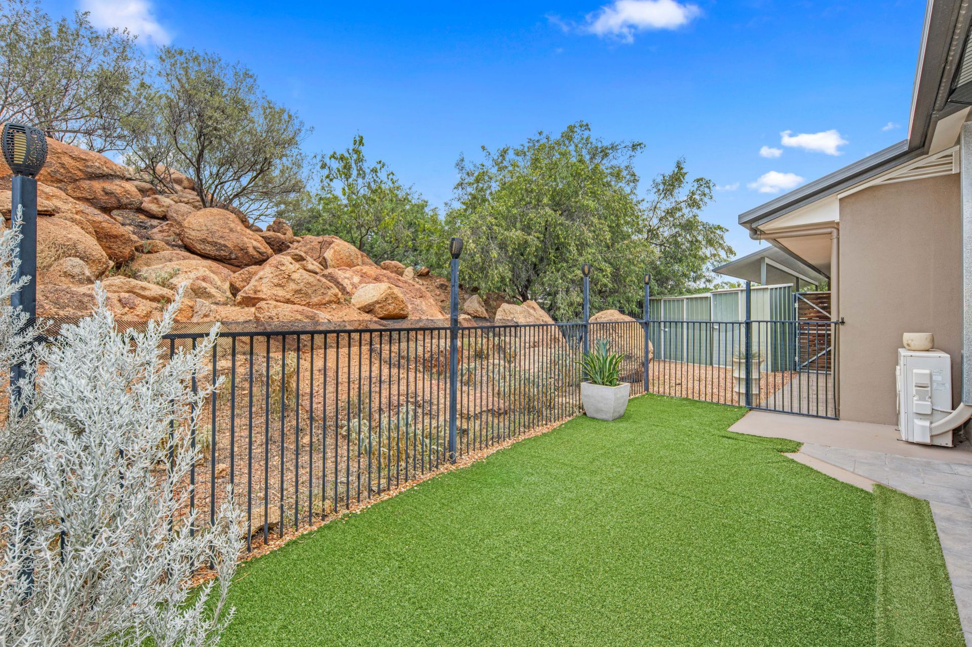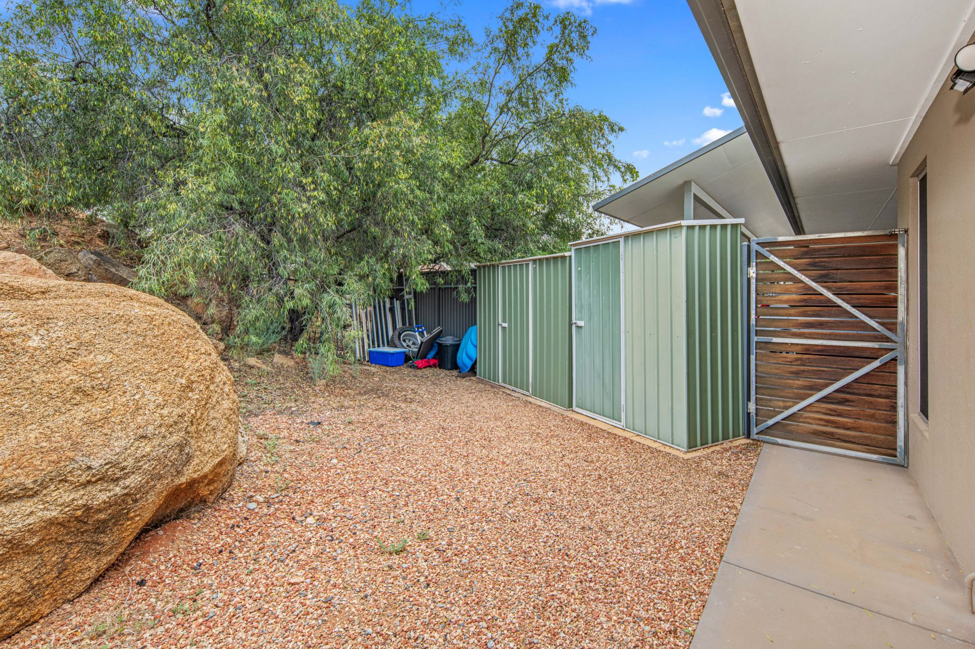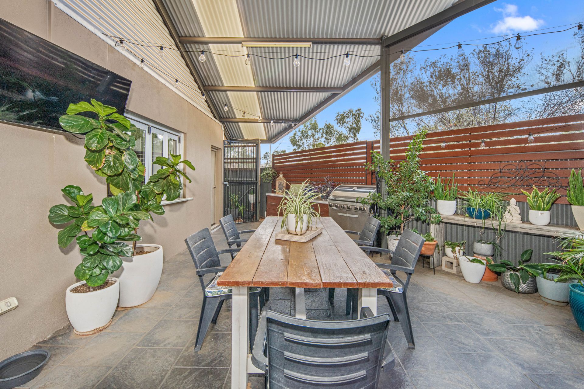 The open-plan living, dining and kitchen area flows effortlessly onto the undercover entertaining space, fitted with pull-down shades, ceiling fans and chic paving-perfect for year-round relaxation or hosting a barbecue with friends. There is also a separate storage room, sensor lighting and two garden sheds for added convenience.
